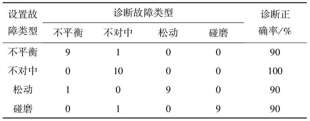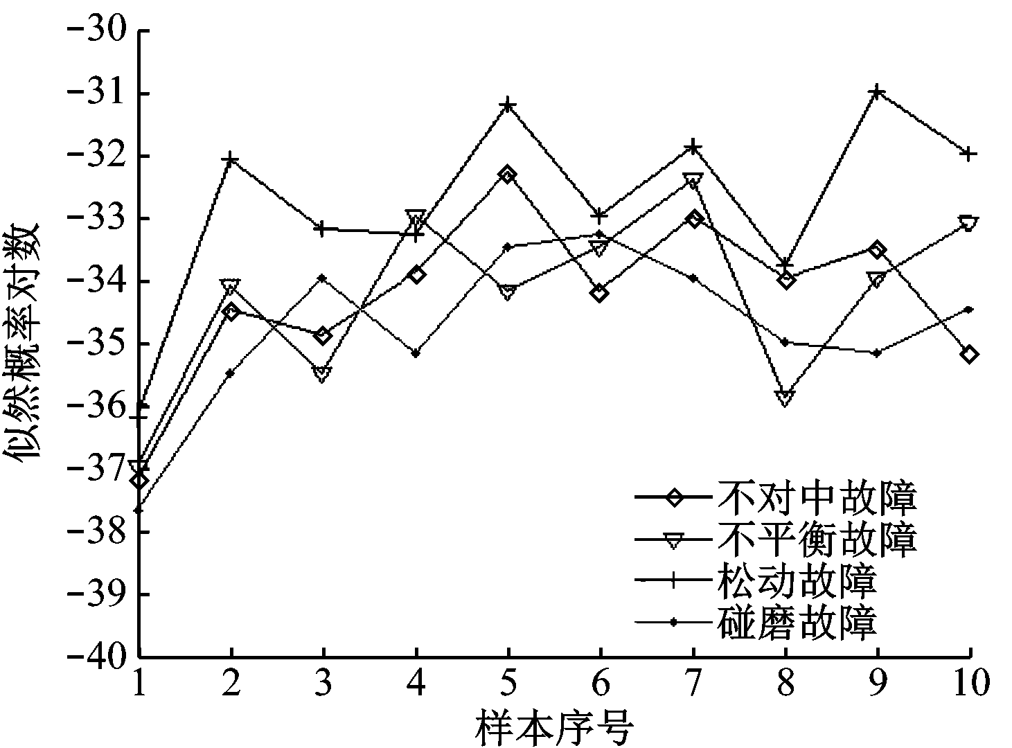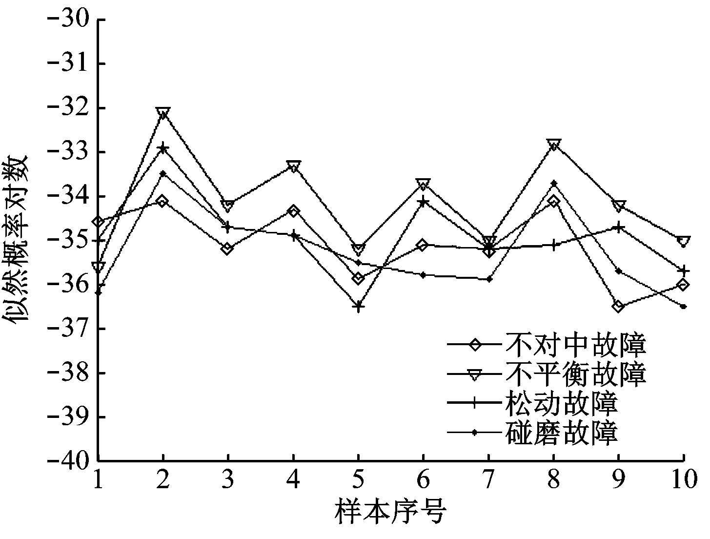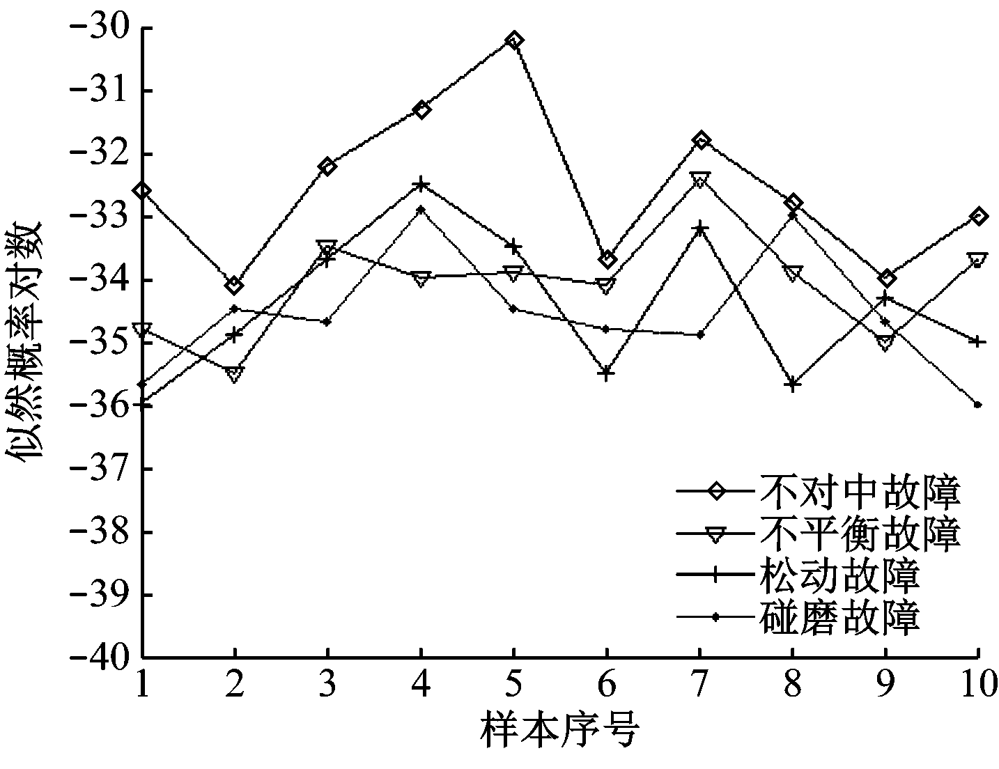 采用4种通风机故障数据试验样本的全谱幅值作为HMM输入量,对基于矢椭谱和HMM的轴流通风机故障诊断方法进行验证。不同故障状态下HMM输出似然概率对数曲线如图4所示,故障诊断结果见表2。可看出不平衡故障诊断正确率为90%,其中1次被诊断为不对中;不对中故障诊断正确率为100%;松动故障诊断正确率为90%,有1次被诊断为不平衡;碰磨故障诊断正确率为90%,有1次被诊断为不对中。试验结果验证了该方法具有较高的故障识别率。