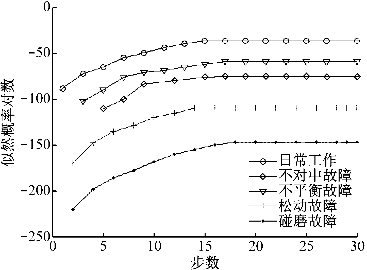 将设置的初始条件及Q作为HMM输入量,由Viterbi算法自动计算输出似然概率(最大迭代步数为30,收敛误差为0.001)。试验得到的不平衡、不对中、松动、碰磨故障及日常工作状态的HMM训练曲线如图3所示。可看出HMM输出的各状态下似然概率对数在大约20步后趋于平稳,表明模型是收敛的,说明训练HMM成功。