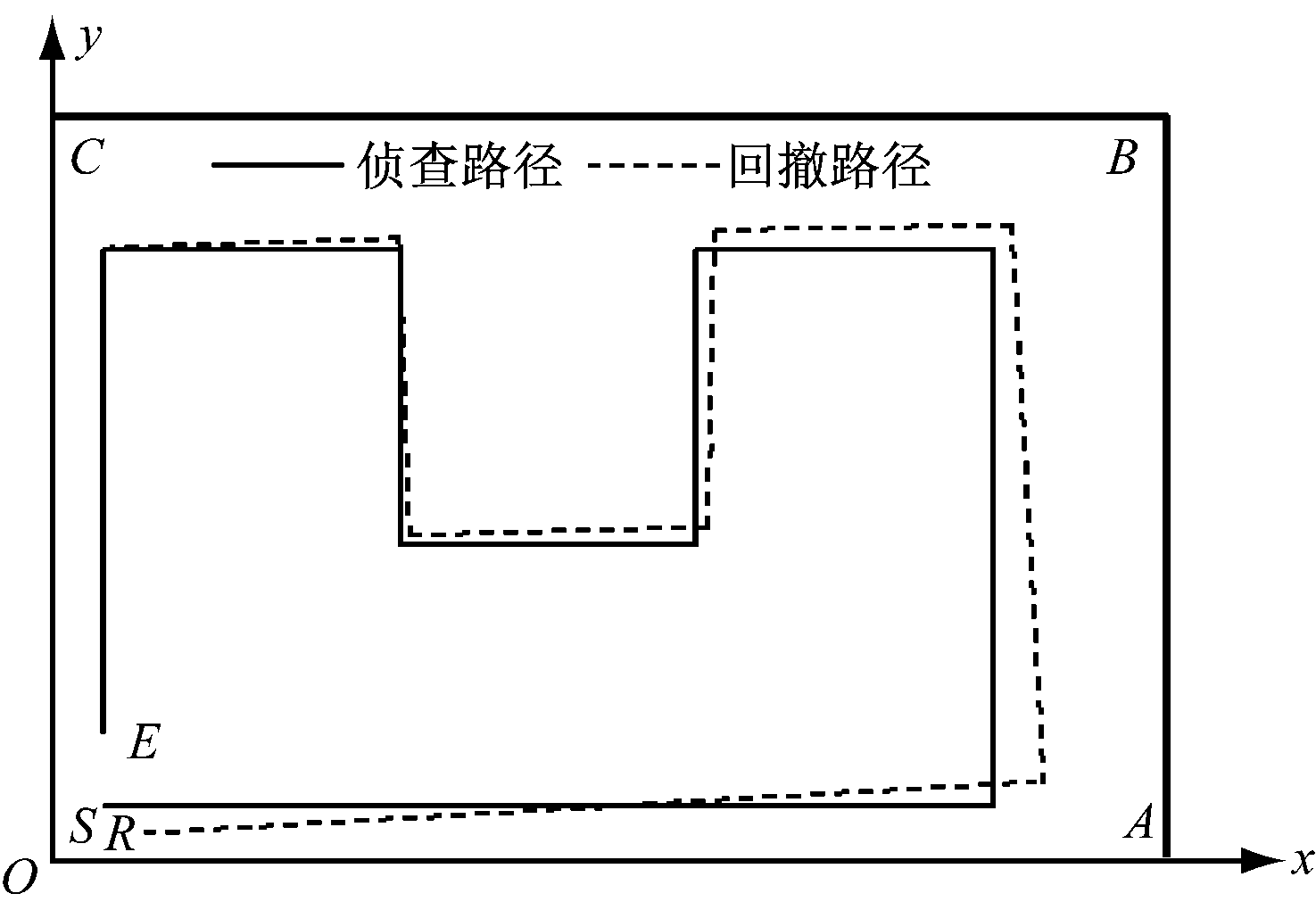 为了检验本文所设计的ZD-2017煤矿探测机器人的中继器弹射系统和失去信号时自动回撤功能的效果,选择尺寸为15 000 mm×10 000 mm的矩形试验场地 (图6所示的矩形OABC)进行测试。ZD-2017煤矿探测机器人在探测阶段,从起始位置S出发,共行进4 500 mm,在此期间,进行多次前进、左转和右转运动并弹射3个与中继器固连的中继器模块支撑架来延长其通信距离,与此同时,通过传感器所收集的数据记录中心的运动轨迹。当操作人员控制机器人沿着试验场地逆时针运动到终点位置E时,将3个被弹射出的中继器关闭,此时,机器人的控制信号被中断,启动自动回撤功能,回撤到起始位置。如果ZD-2017煤矿探测机器人单独依据编码器所收集的数据信息来进行回撤,测试所记录的运动轨迹,如图6(a)所示;而在初始运动路径相同的情况下,以编码器所记录的数据为基础,并利用激光传感器所收集的数据进行ICP算法配准运动相对变化量qk,进而利用ICP算法进行