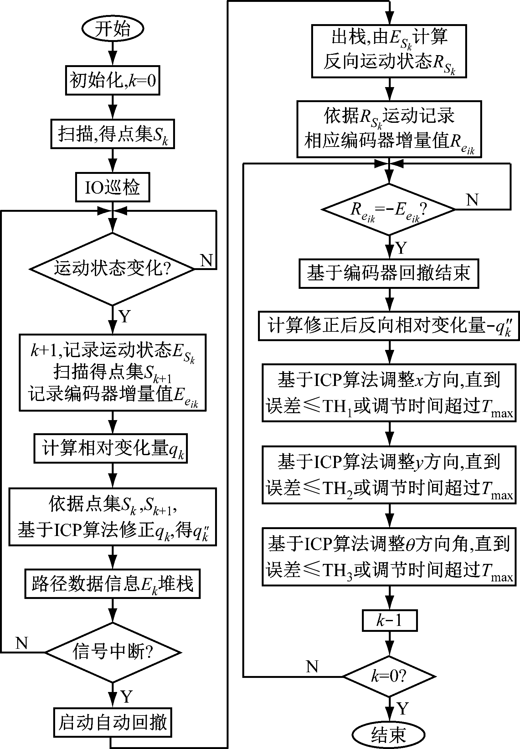 即便ZD-2017煤矿探测机器人可通过车载中继器弹射系统延长其通信距离,但当矿难发生时,井下环境非常复杂,其与上位机的通信很容易被突然中断,一旦通信中断,后方的操作人员将失去对ZD-2017煤矿探测机器人的控制,机器人将不能继续正常作业。为了确保可以完成整个探测任务,ZD-2017煤矿探测机器人设计有自动回撤功能,即当无线通信突然中断时,机器人将启动自动回撤功能,沿其探测时的运动路径原路返回,直到回撤到无线通信正常的区域。自动回撤由路径记忆和按原路返回2个阶段组成。在路径记忆阶段,ZD-2017煤矿探测机器人不仅可采集环境信息,而且可根据编码器和激光传感器采集的数据记录该过程相应的运动路径信息;在按原路返回阶段,ZD-2017煤矿探测机器人利用已采集的路径信息与回撤时传感器获得的路径信息进行数据匹配,实现按原路径返回。采用编码器与激光传感器集成数据的方法,且基于迭代最近点(Iterative Closest Point ,ICP)算法进行双重数据匹配,以逐步调整机器人的位置和方向角,从而达到较高的回撤精度。自动回撤算法的流程如图5所示。