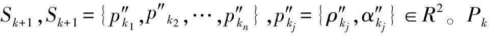 (1) 创建堆栈并进行初始化,k=0(k为此时刻所处的运动状态);机器人以初始位置点Pk为参考位置点,并做一次激光传感器扫描,得到参考扫描点集Sk,Sk={pk1,pk2,…,pkn}(Sk为第k种运动状态下激光传感器的扫描点集,其中k=1,2,…,n,n为探测过程中运动状态的数目),pki={ρki,αki}∈R2(R2为二维空间)。