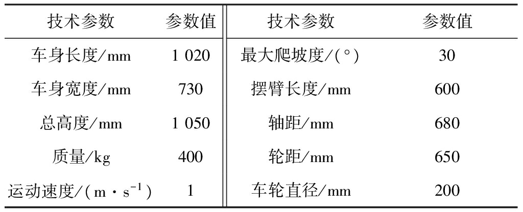 ZD-2017煤矿探测机器人的移动底盘采用履带传动结构[13-14],即由2个直流伺服电动机分别驱动车体左右两侧的履带轮。此外,在车身的前后部各安装2个摆臂,从而确保ZD-2017煤矿探测机器人可以爬斜坡和跨越台阶。ZD-2017煤矿探测机器人选用48 V/60 A·h可充电锂电池作为电源模块,其主要技术参数见表1。