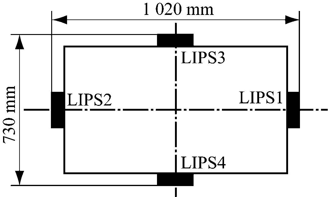 ZD-2017煤矿探测机器人车体内外分别安装有各种传感器。车体内部安装的传感器主要包括用于测量车体侧倾斜的倾角仪、用于记录两侧车轮位移的编码器、用于记录摆臂相对于车身转角的电位计。车体外部安装的传感器主要包括温度传感器、压力传感器、各种气体检测传感器、激光测距传感器。其中,激光测距传感器(LIPS1—LIPS4)共有4个,分别安装于车体正前方、正后方、左右两侧的中间位置,如图2所示。此外,分别在车体左右两侧安装了扬声器,在车体前方、后方和左右两侧位置安装了多个矿用本质安全型便携式无线摄像机,利用图像分割器获得环境中多方位的图像信息。
