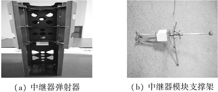 ZD-2017煤矿探测机器人通过中继器弹射系统延长其通信距离。中继器弹射系统包括6组中继器弹射器及与中继器固连的中继器模块支撑架。弹射器如图3(a)所示,利用继电器来开启弹射器的弹射开关;中继器模块支撑架如图3(b)所示,结构设计参考了雨伞的工作原理。ZD-2017煤矿探测机器人工作时,弹射器固定在其车身后部,中继器模块支撑架折叠放置在弹射器中。当操作人员发现ZD-2017煤矿探测机器人所在工作环境信号较弱时,通过上位机控制第1组弹射器的电磁式行程开关将相应的中继器模块支撑架弹射出去,由于各中继器模块及外部网络可以互相通信,所以,此时第1组中继器的网络将与外部网络及任意一个车载中继器的网络相连,从而将外部网络信号进行转发,起到延长通信距离的作用。每个中继器的传输距离为1 000 mm左右。ZD-2017煤矿探测机器人车载6组中继器弹射模块,所以,在井下作业时可将工作行程延长到6 000 mm。