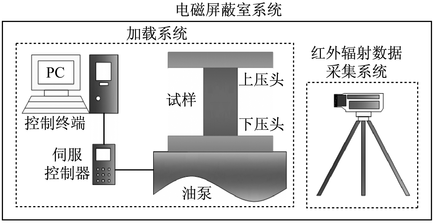 实验系统包括加载系统、红外辐射数据采集系统、电磁屏蔽室系统,如图1所示。加载系统采用YAW4306微机控制电液伺服压力试验机。红外辐射数据采集系统采用Optris PI450高分辨率红外热像仪,其光学分辨率为382×288像素,测温范围为-20~100 ℃,光谱范围为7.5~13 μm,帧频为80 Hz,视场角为30°×23°,热灵敏度为0.04 K。电磁屏蔽室系统采用GP6电磁屏蔽室,其屏蔽效果在85 dB以上,可有效减少外界环境中的红外辐射对实验信号的干扰。