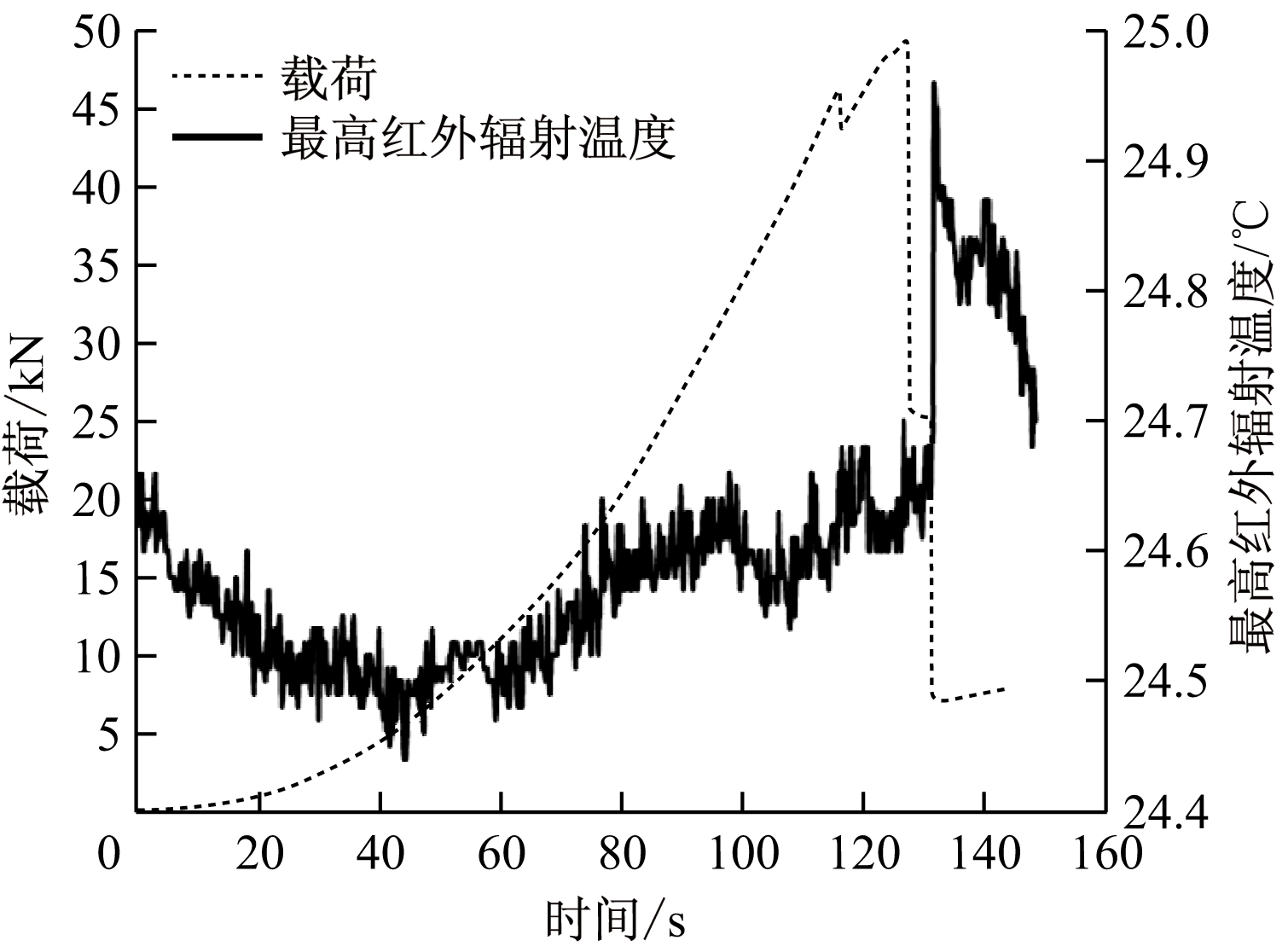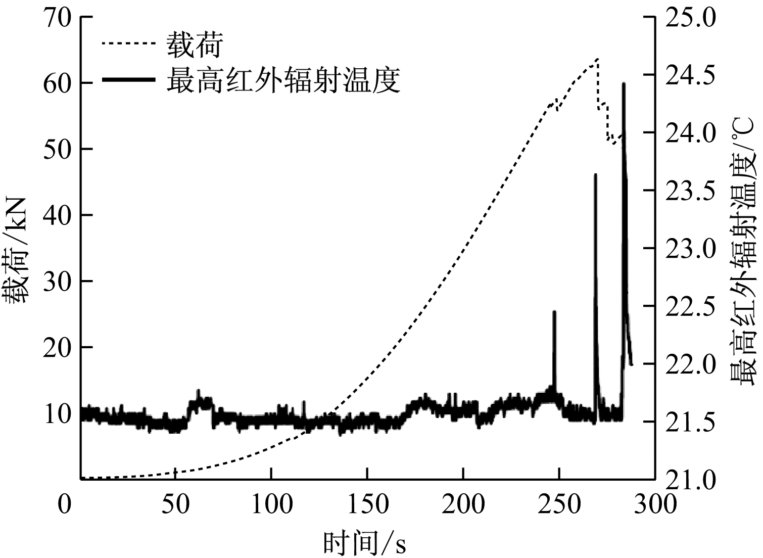 红外辐射温度的表征参数主要有最高红外辐射温度和平均红外辐射温度。最高红外辐射温度指红外热像仪测量的温度场内温度最大值,其反映物体红外辐射的最大强度;平均红外辐射温度指测量的温度场内平均温度,其反映岩石表面红外辐射的整体强度。平均红外辐射温度不能有效表达物体表面红外辐射温度场的空间分布及差异特征。因此,本文选择最高红外辐射温度曲线来研究煤岩损伤演化特征。