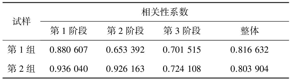 利用式(10)可得基于最高红外辐射温度积累量的计算应力和实测应力对应关系,如图4所示。计算应力与实测应力的相关性见表1。由表1可看出,试样计算应力和实测应力在各个阶段的相关性系数达0.65以上,呈显著相关,整体相关性系数达0.8以上,呈高度相关,所以基于最高红外辐射温度积累量的计算应力和实测应力达到显著相关水平,计算应力能够很好地反映煤岩破坏过程中的实测应力。由图4可看出,计算应力-应变曲线峰值超前于实测应力-应变曲线峰值,为煤岩动力灾害的监测预警提供了一种新思路和方法。