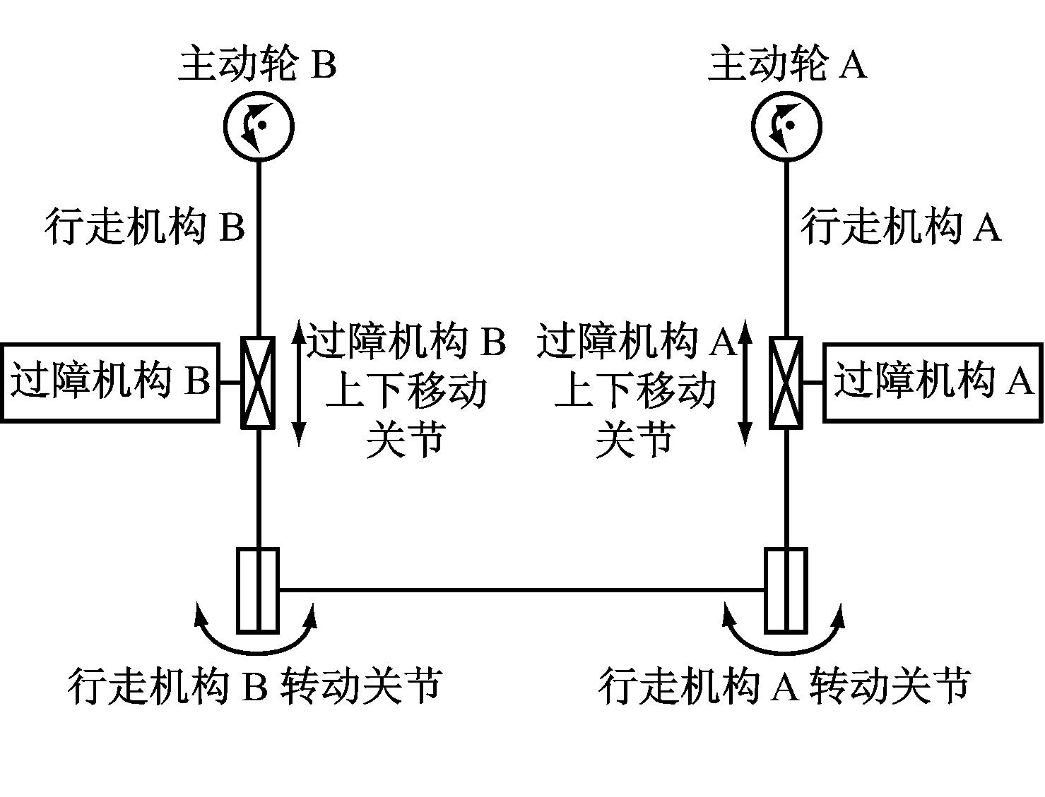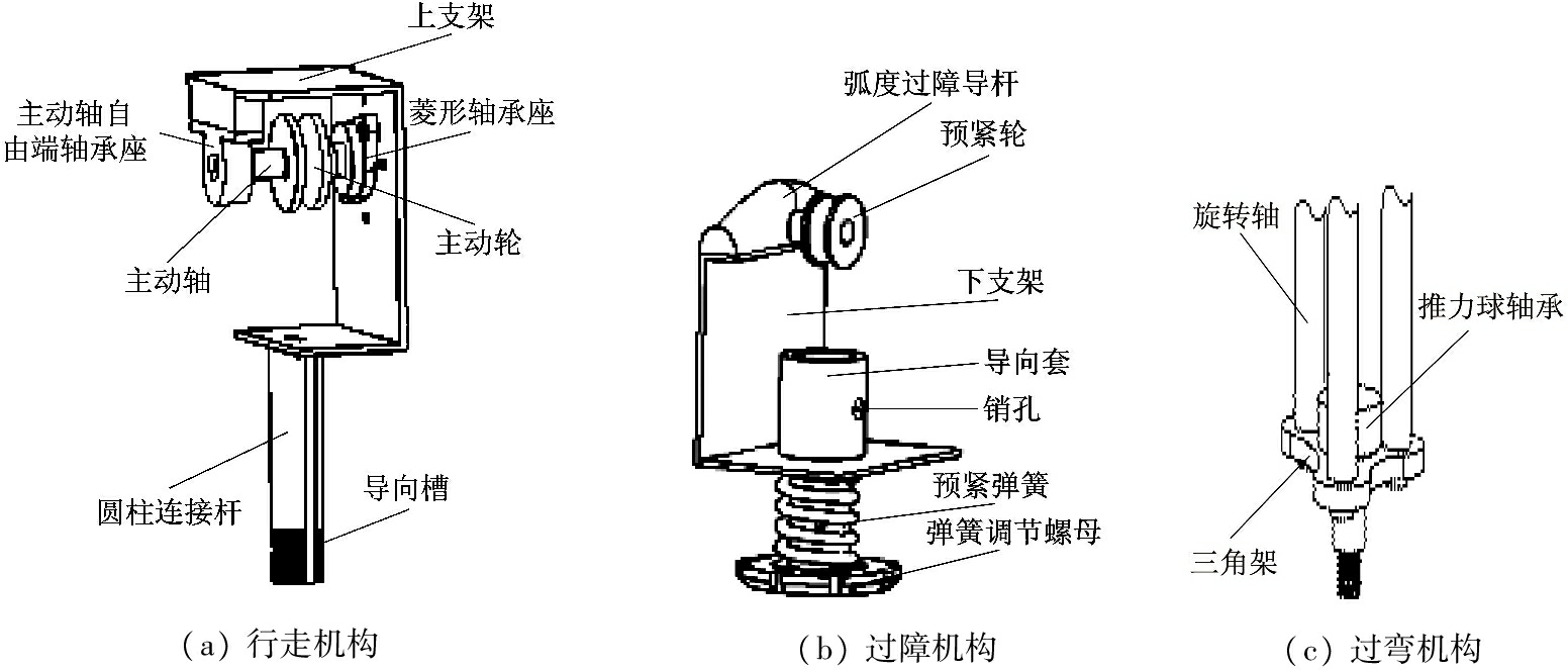 过弯机构主要由三角架、旋转轴和推力球轴承组成,如图3(c)所示。三角架与3根旋转轴连接,中间开设有通孔,滑杆用于连接上支架和模块搭载框架。旋转轴内部安装推力球轴承,并与三角架中间的通孔配合,下方开有螺纹,与模块搭载框架连接。巡检机器人通过旋转轴与三角架之间的转动实现过弯时偏转。