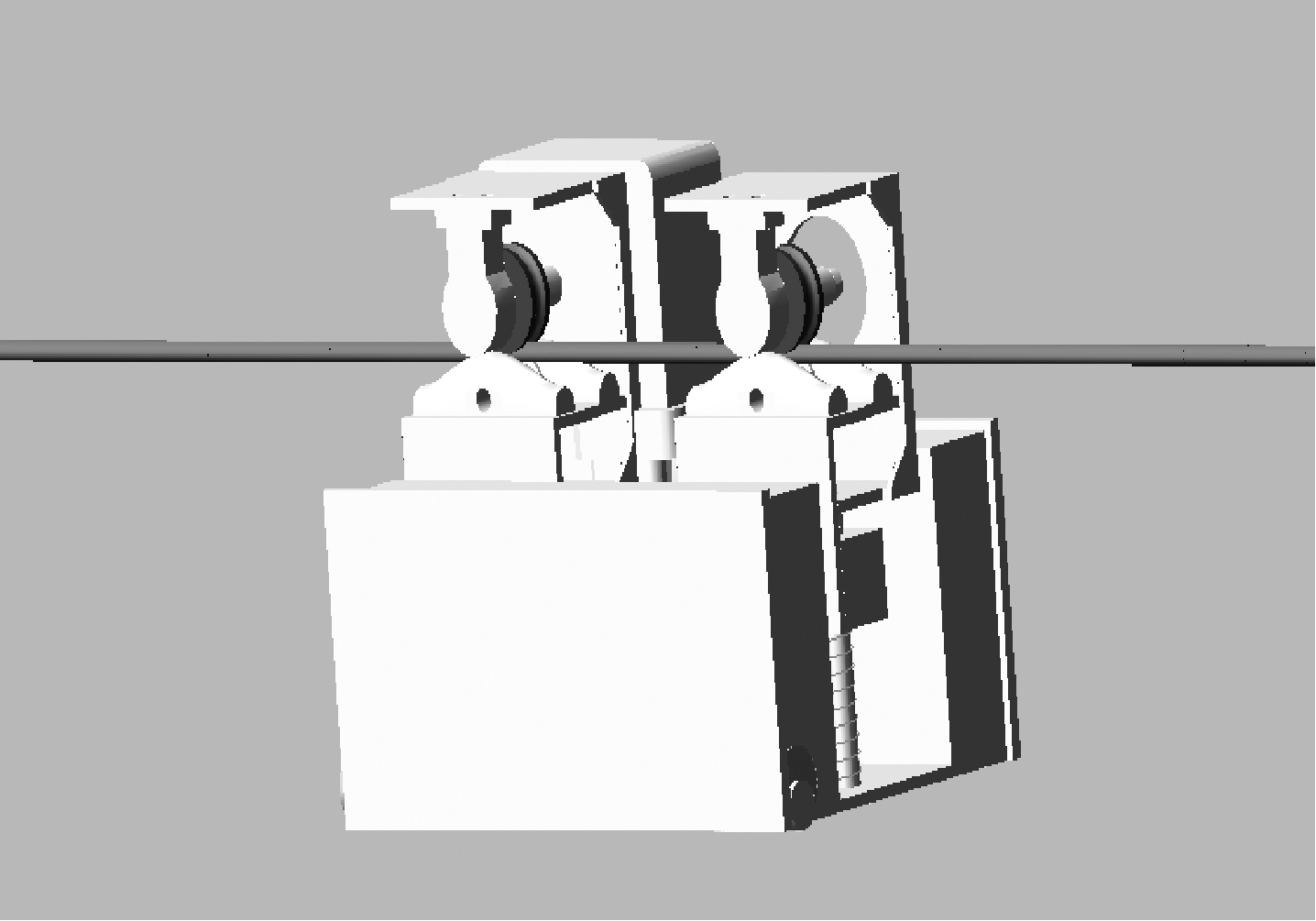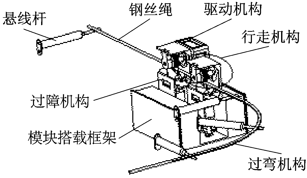 巡检机器人采用模块化设计,主要由行走机构、驱动机构、过障机构、过弯机构、模块搭载框架组成,其SolidWorks三维结构模型如图2所示。悬线杆间隔架设于井下巷道侧顶壁,用于搭载悬线钢丝绳,形成巡检轨道。驱动机构由电动机和减速器组成,与行走机构、过障机构、过弯机构、模块搭载框架装配组成巡检机器人主体结构,完成巡检机器人在巡检轨道上的行走、过障等动作。