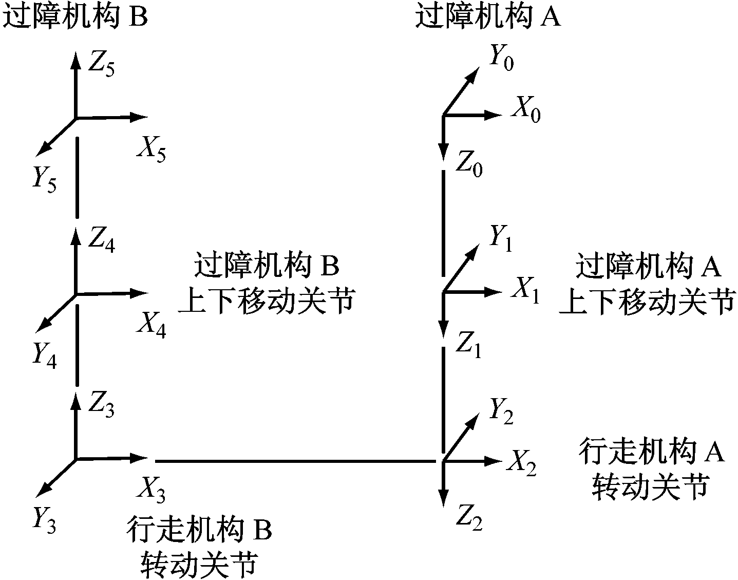 巡检机器人的运动学仿真以巡检机器人各杆件的坐标系为基础。将巡检机器人简化为由过障机构和行走机构组成的前后两臂机构,如图4(a)所示。采用D-H法对各杆件建立坐标系,如图4(b)所示。D-H法用于描述各杆件在坐标系的结构、位形和姿态,以此确定2个相邻关节之间的相对位置和方向。图4(b)中,过障机构A为固定基座,过障机构B为末端执行器,设过障机构A、过障机构A上下移动关节、行走机构A转动关节、行走机构B转动关节、过障机构B上下移动关节、过障机构B编号依次为0—5,其坐标系分别为X0Y0Z0—X5Y5Z5。根据D-H法坐标系确定规则,Z轴为沿机构竖直运动方向,X轴为Z轴的任意一条垂线,Y轴由右手螺旋定则确定[13]。