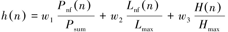 式中:Pnf(n)为当前位置节点到目标点的综合威胁概率;Psum为总航迹威胁概率;Lnf(n)为当前位置节点到目标点的航迹长度;w1,w2,w3分别为Pnf(n),Lnf(n),H(n)的权重系数。
