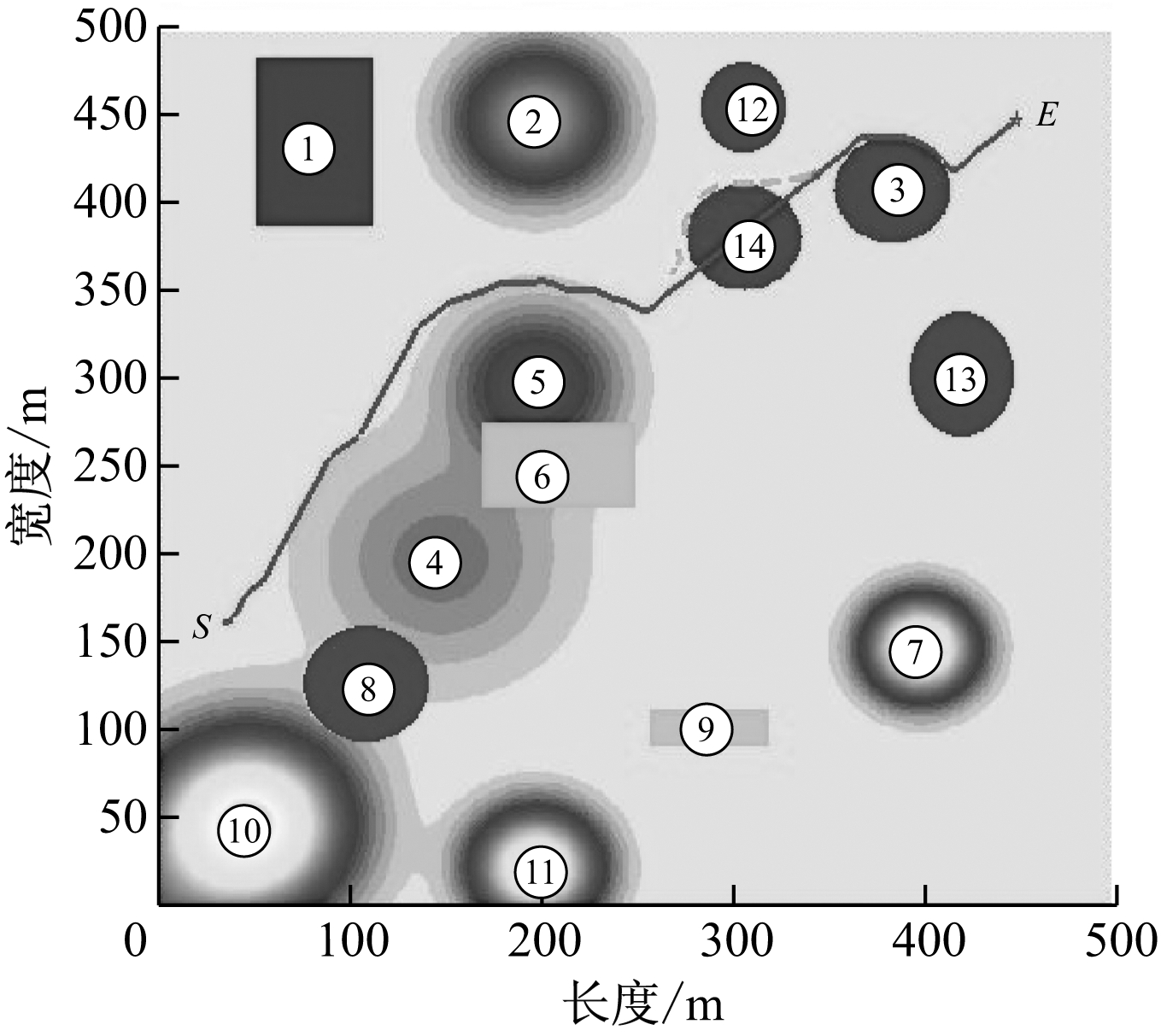 。设置无人机的起始点坐标为S(34,159),目标点坐标为E(451,444),最大飞行高度Hmax=5 m,最大航程Lmax=2 km,最小航段长度lmin=3.5 m,权重系数w3=0.1,各威胁中心坐标、威胁作用半径和高度等数据见表1。