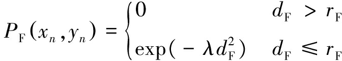 式中:PF(xn,yn)为无人机在当前位置节点坐标(xn,yn)处受到的火焰威胁概率;dF为无人机与火焰中心的实际距离;rF为火焰的威胁作用半径;λ为井下惰性气体比例。