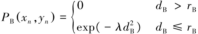 式中:PB(xn,yn)为无人机在当前位置节点坐标(xn,yn)处受到的爆炸威胁概率;dB为无人机与爆炸中心的实际距离;rB为爆炸的威胁作用半径。