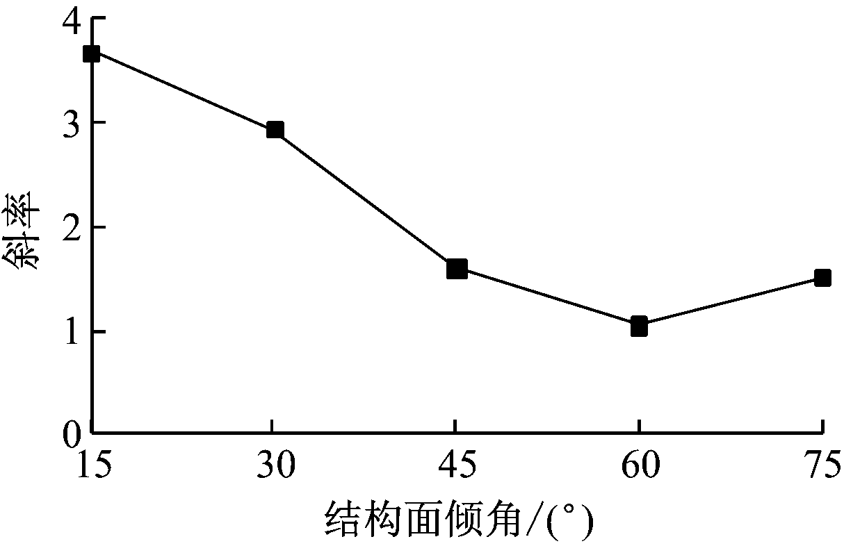 图3中不同结构面倾角时煤柱最大主应力曲线有明显的线性关系,因此求出各曲线斜率,得到斜率随结构面倾角变化曲线,如图4所示。可看出随着结构面倾角的增大,曲线斜率逐渐减小,表明煤柱最大主应力随结构面间距变化的幅度越来越小,即结构面间距对煤柱最大主应力的影响越来越小。