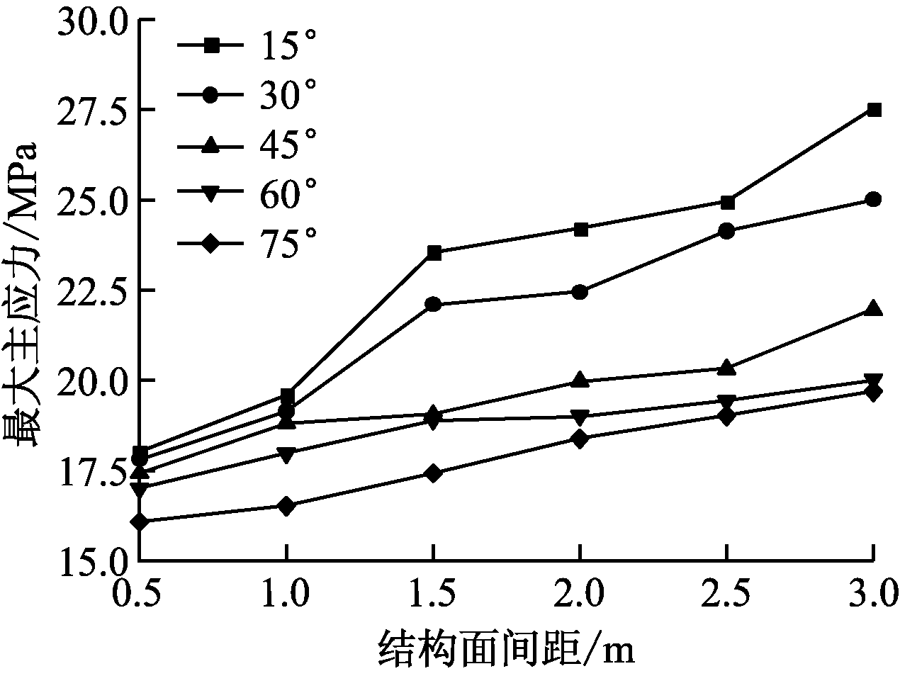 (1) 煤柱内最大主应力随结构面间距增大而增大,随结构面倾角增大而减小;随着结构面倾角的增大,结构面间距对煤柱最大主应力的影响越来越小。