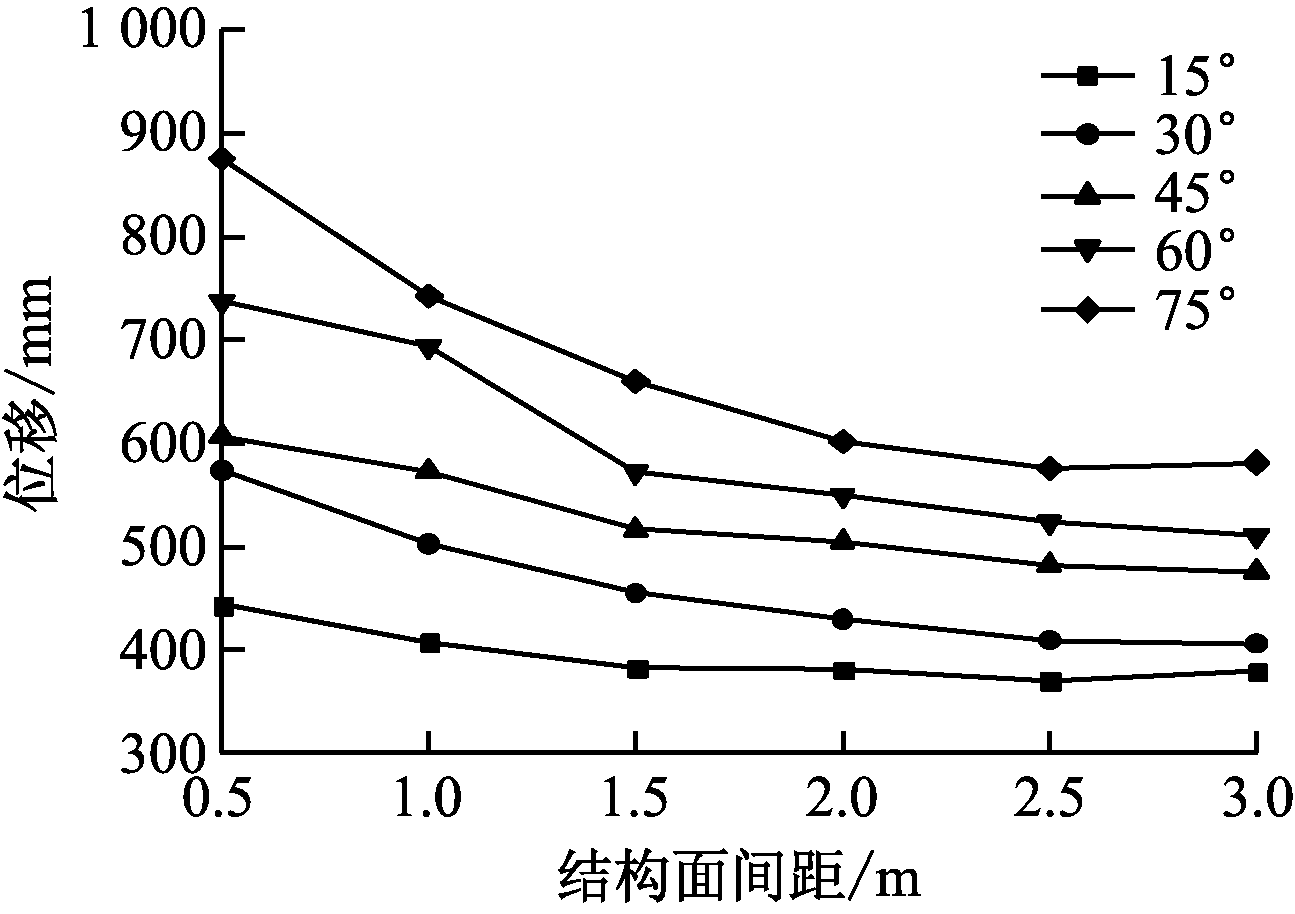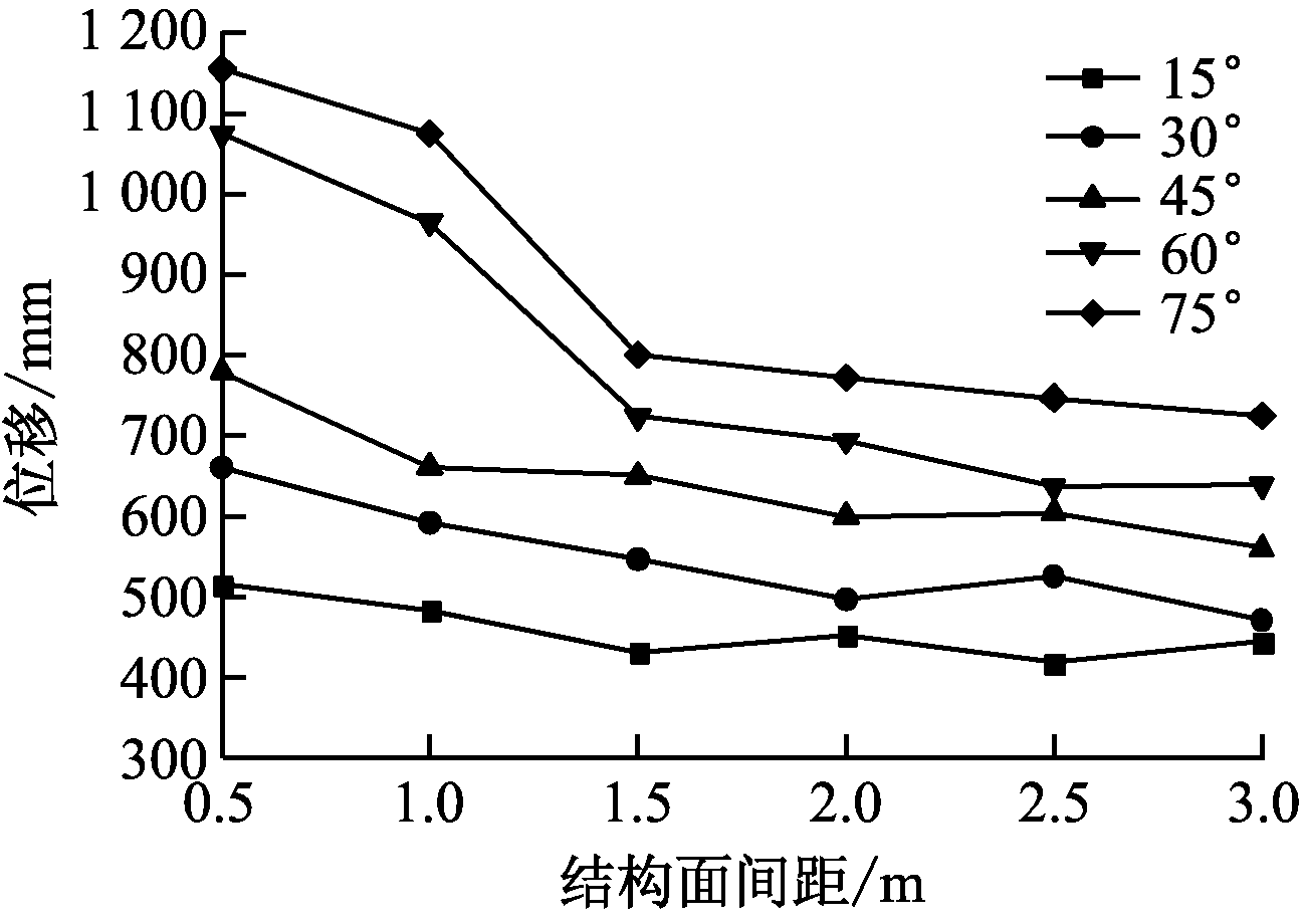 为获得不同结构面倾角及间距对煤柱变形的影响规律,设置结构面倾角分别为15,30,45,60,75°,结构面间距分别为0.5,1.0,1.5,2.0,2.5,3.0 m,以结构面倾角及间距2个因素进行正交设计。