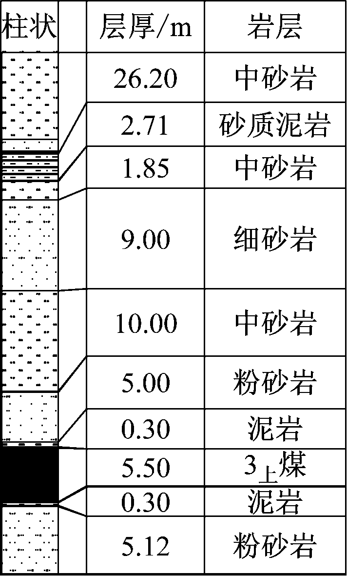 山东枣庄某矿东十采区3上1007工作面所在煤层为3上煤层,地面标高+35.44 m,工作面煤层底板标高-540.0 m。工作面走向长724 m,倾向长175 m,煤层平均厚度为5.5 m,倾角为5~9°。工作面内赋存13条断层,内生裂隙较发育,对工作面回采造成较大影响。煤层综合柱状图如图1所示。