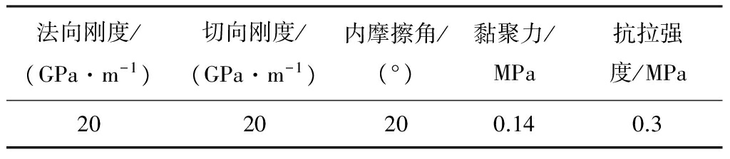 模型上部边界为自由边界,由巷道埋深及覆岩平均密度计算可得上部边界载荷为15 MPa,模型下表面固定,两侧面采用应力边界进行固定。模型中各煤岩层力学参数见表1,煤柱内结构面力学参数见表2。