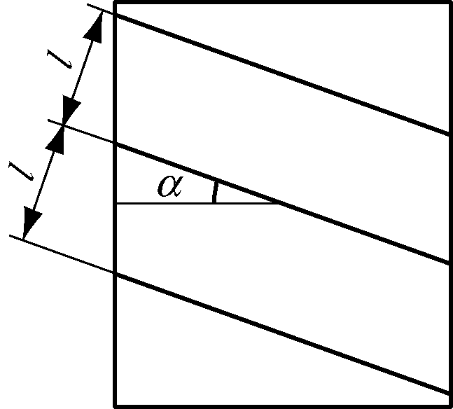 根据实际地质情况及3上1007工作面布置方式建立数值计算模型。模型长×宽×高为90 m×20 m×90 m;煤柱位于模型中部,高度为4.5 m,宽度为5 m,煤柱两侧分别为巷道及采空区;各岩层及结构面采用Mohr-Coulomb准则。煤柱内结构面分布方式如图2所示,其中α,l分别为结构面倾角、间距。