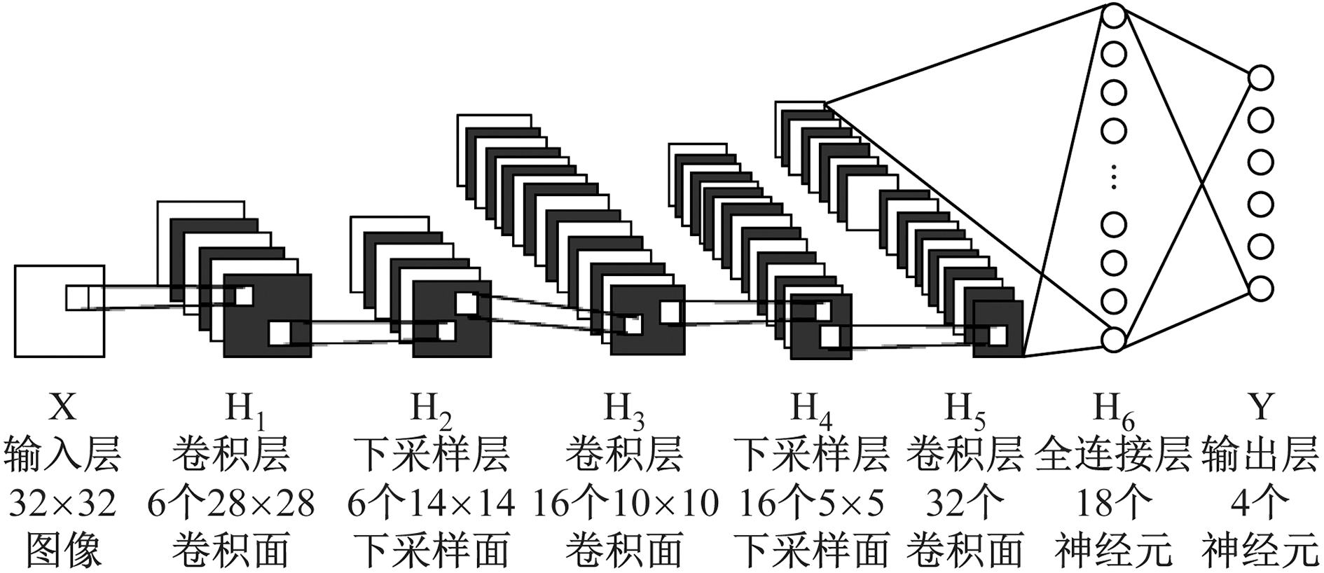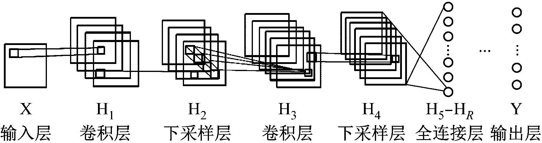 卷积神经网络是受到视觉神经系统的启发,针对二维形状的识别而设计的一种多层感知器,在平移的情况下具有高度不变性,在缩放和倾斜的情况下也具有一定的不变性。作为一种特殊的前馈神经网络模型,标准卷积神经网络通常具有比较深的结构,一般由输入层、卷积层、下采样层、全连接层及输出层组成[9],如图1所示。其中输入层通常是一个矩阵,卷积层和采样层可以看作是特殊的隐含层,而其他层是普通的隐含层,这些层一般具有不同的计算方式,权值大多需要通过学习来优化;H5—HR为全连接层,R为全连接层层数。