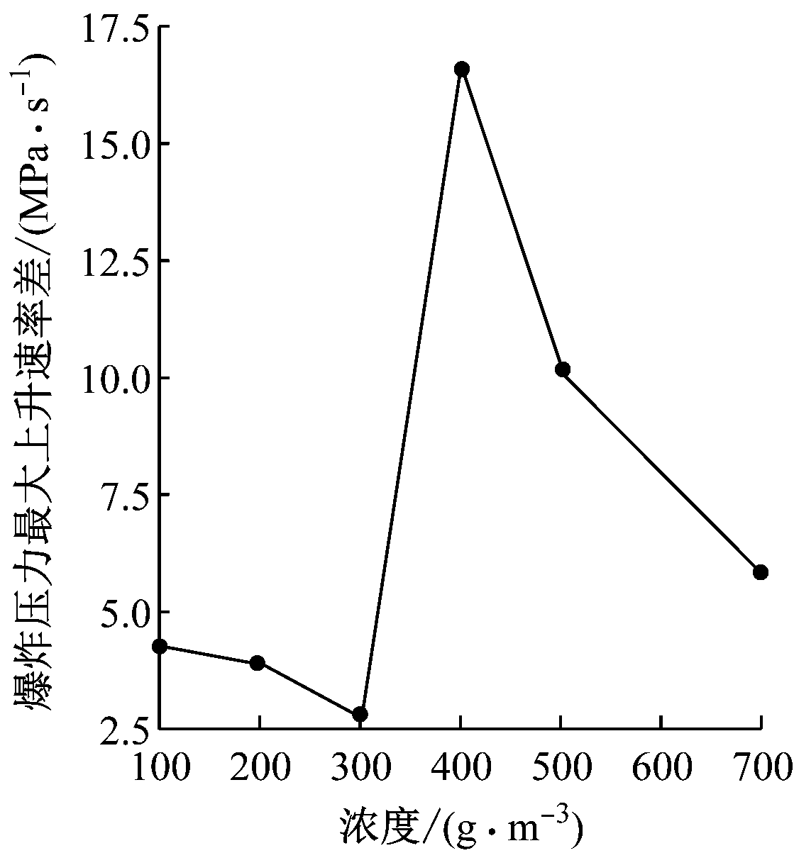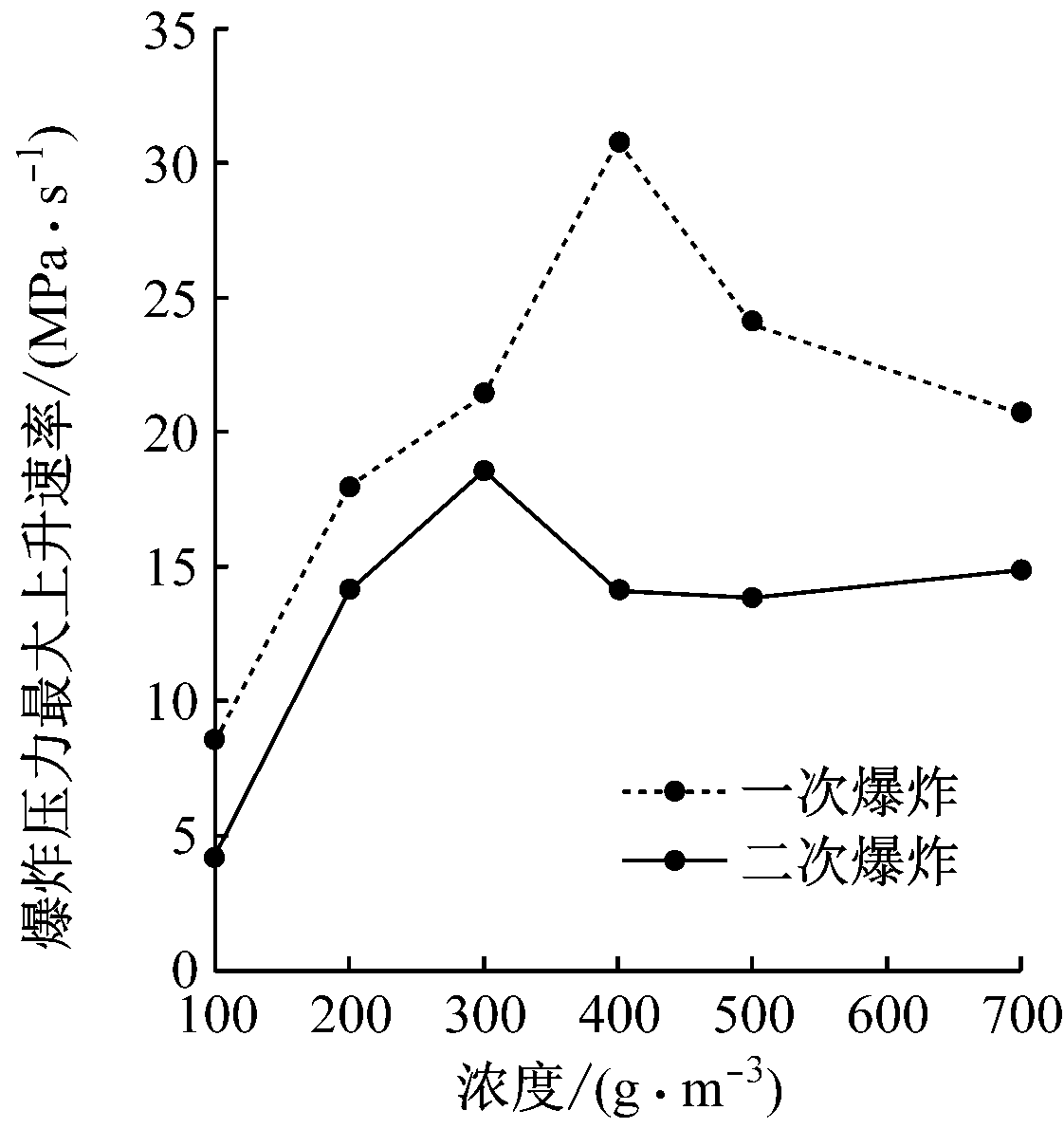 随着煤尘浓度的增加,煤尘二次爆炸压力最大上升速率呈先增大后减小的变化趋势,爆炸压力最大上升速率差先减小后增大再减小。爆炸压力最大上升速率差在煤尘浓度为300 g/m3时达到波谷,在煤尘浓度为400 g/m3时达到峰值,在煤尘浓度高于400 g/m3后急剧减小。这是由于随着煤尘浓度的增加,氧气成为制约爆炸反应的主要因素,有效参与燃烧反应的煤尘减少,过多的煤尘抑制反应的进行[12],爆炸反应时间增加,且爆炸压力开始缓慢降低,导致一次爆炸压力最大上升速率明显减小;参与二次爆炸的固态产物在一次爆炸过程中受热导致表面软化并产生黏性,在爆炸冲击波作用下,煤尘颗粒间碰撞粘结[13],使部分颗粒尺寸和质量增大,在二次爆炸中煤尘浓度继续增加,但悬浮的颗粒浓度变化较小,爆炸压力和爆炸反应时间变化较小,导致爆炸压力最大上升速率缓慢变化。二次爆炸压力最大上升速率的缓慢变化与一次爆炸时的迅速减小形成鲜明对比,造成爆炸压力最大上升速率差急剧下降。