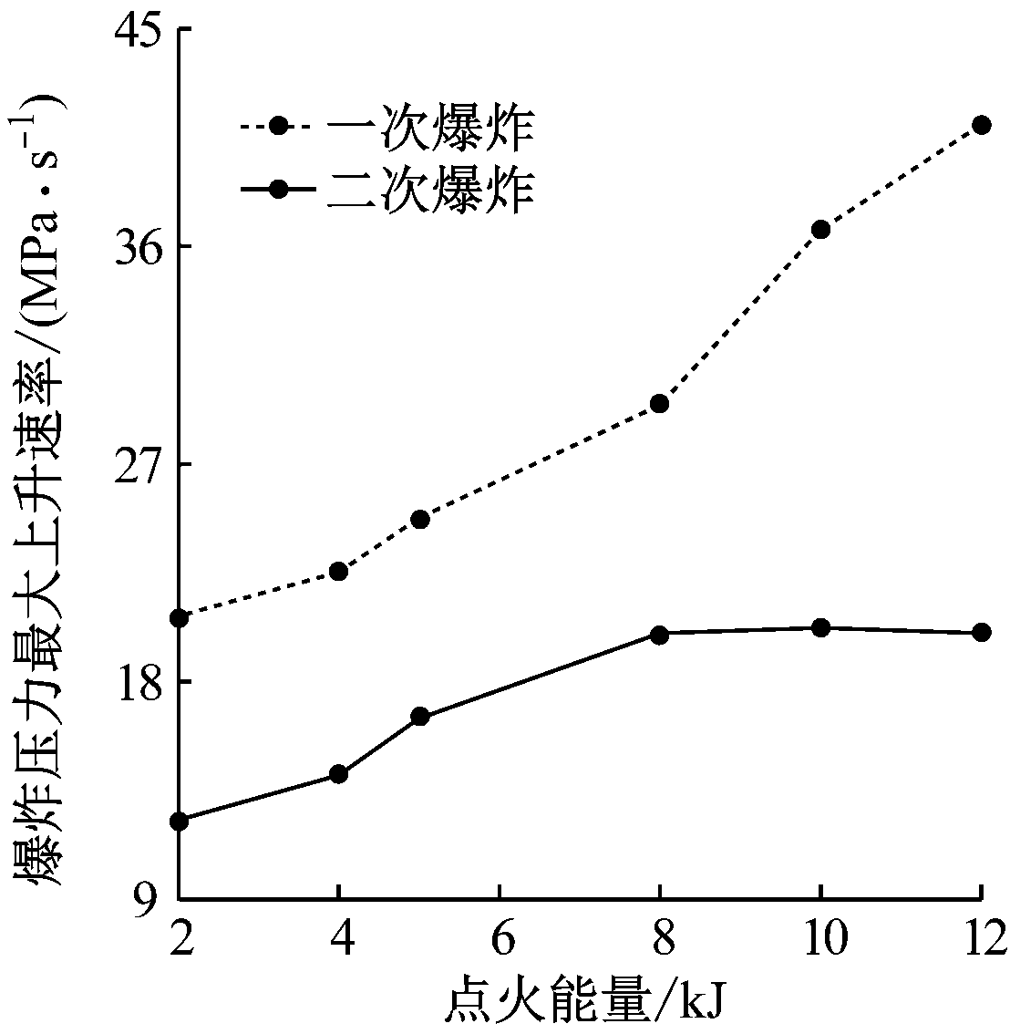 随着点火能量的增加,煤尘二次爆炸压力最大上升速率和爆炸压力最大上升速率差均呈增大的变化趋势;与一次爆炸时相比,二次爆炸压力最大上升速率在点火能量高于8 kJ后基本保持不变。这是由于在一次爆炸过程中,随着点火能量增大,点火产生的冲击强度增加,引起腔体内气体湍流,加速颗粒融化和挥发分的燃烧,爆炸最大压力升高,促进爆炸压力最大上升速率快速增大[15];在二次爆炸过程中,虽然点火能量增加能够使爆炸压力最大上升速率增大,但一次爆炸后的固态产物挥发出的可燃气体相对减少,爆炸反应时间增加,爆炸压力变化缓慢,爆炸压力最大上升速率增加缓慢。二次爆炸压力最大上升速率的缓慢变化与一次爆炸时的快速上升形成鲜明对比,因此爆炸压力最大上升速率差不断增大。