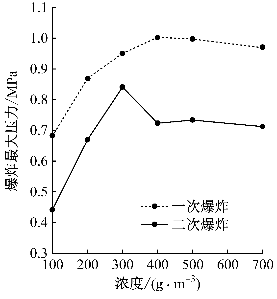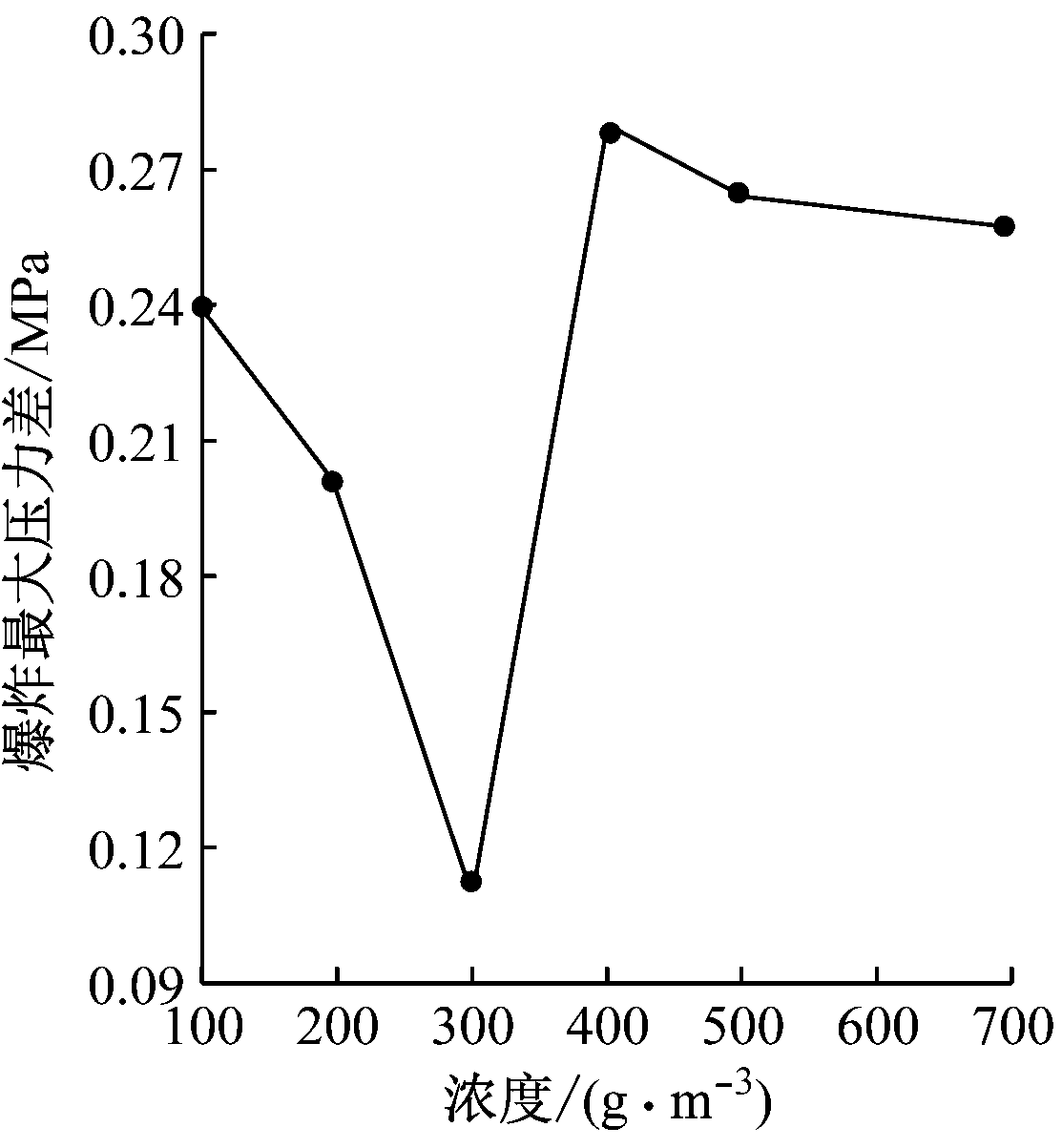 在煤尘粒径为37~75 μm,点火能量为5 kJ条件下,分别加入煤尘浓度为100,200,300,400,500,700 g/m3的煤尘进行爆炸实验,结果如图2所示。