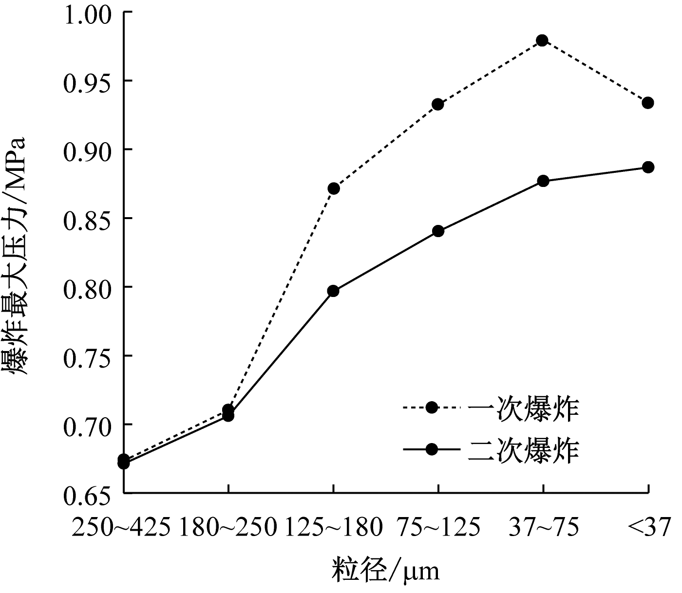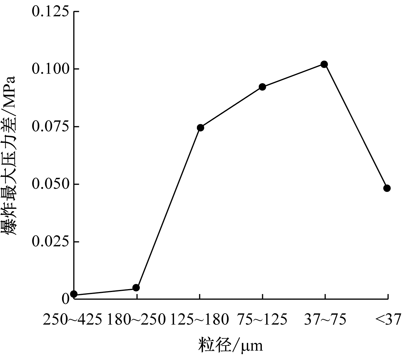 在煤尘浓度为400 g/m3,点火能量为5 kJ条件下,分别加入粒径为250~425,180~250,125~180,75~125,37~75,<37 μm的煤尘进行爆炸实验,结果如图3所示。