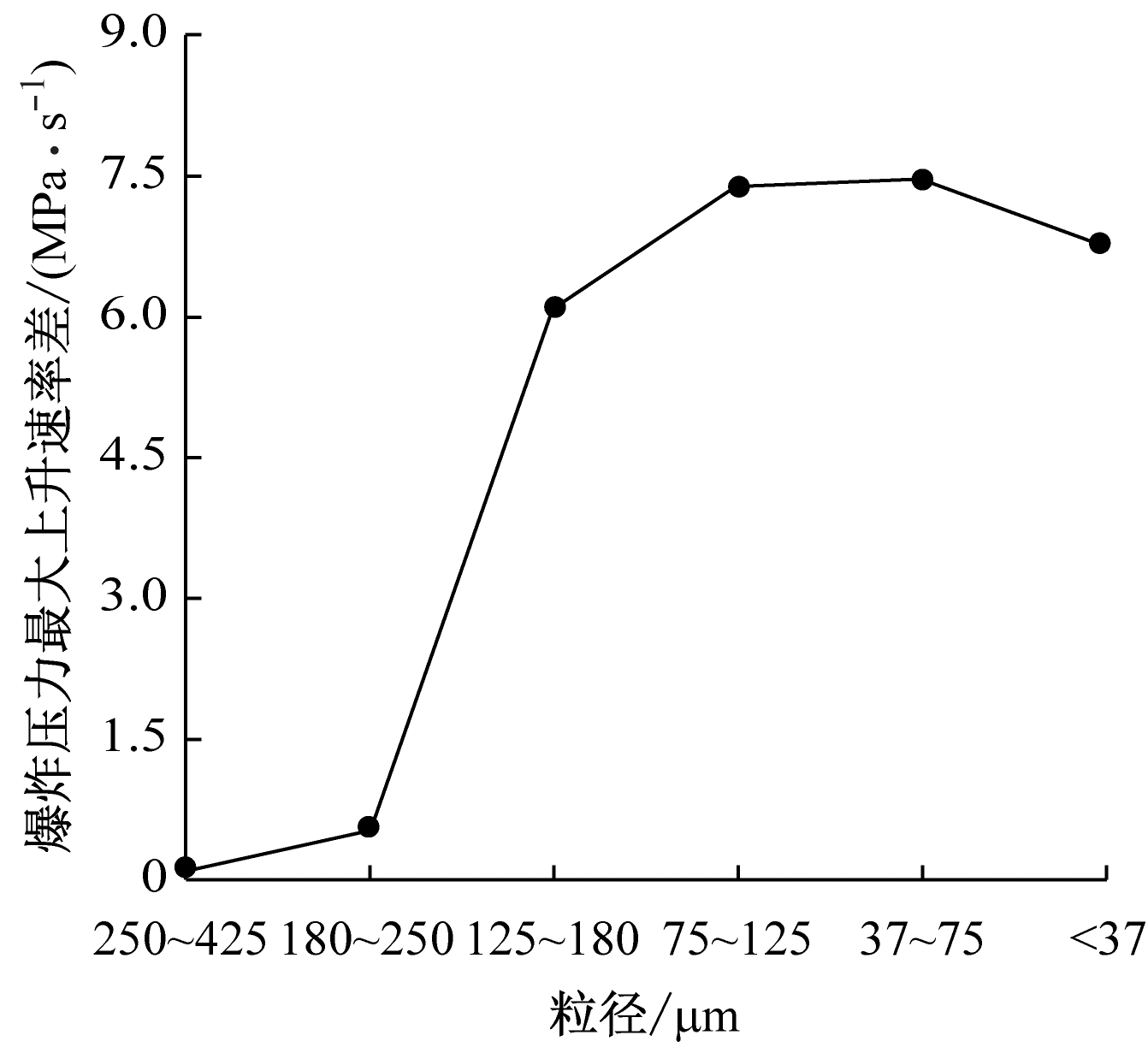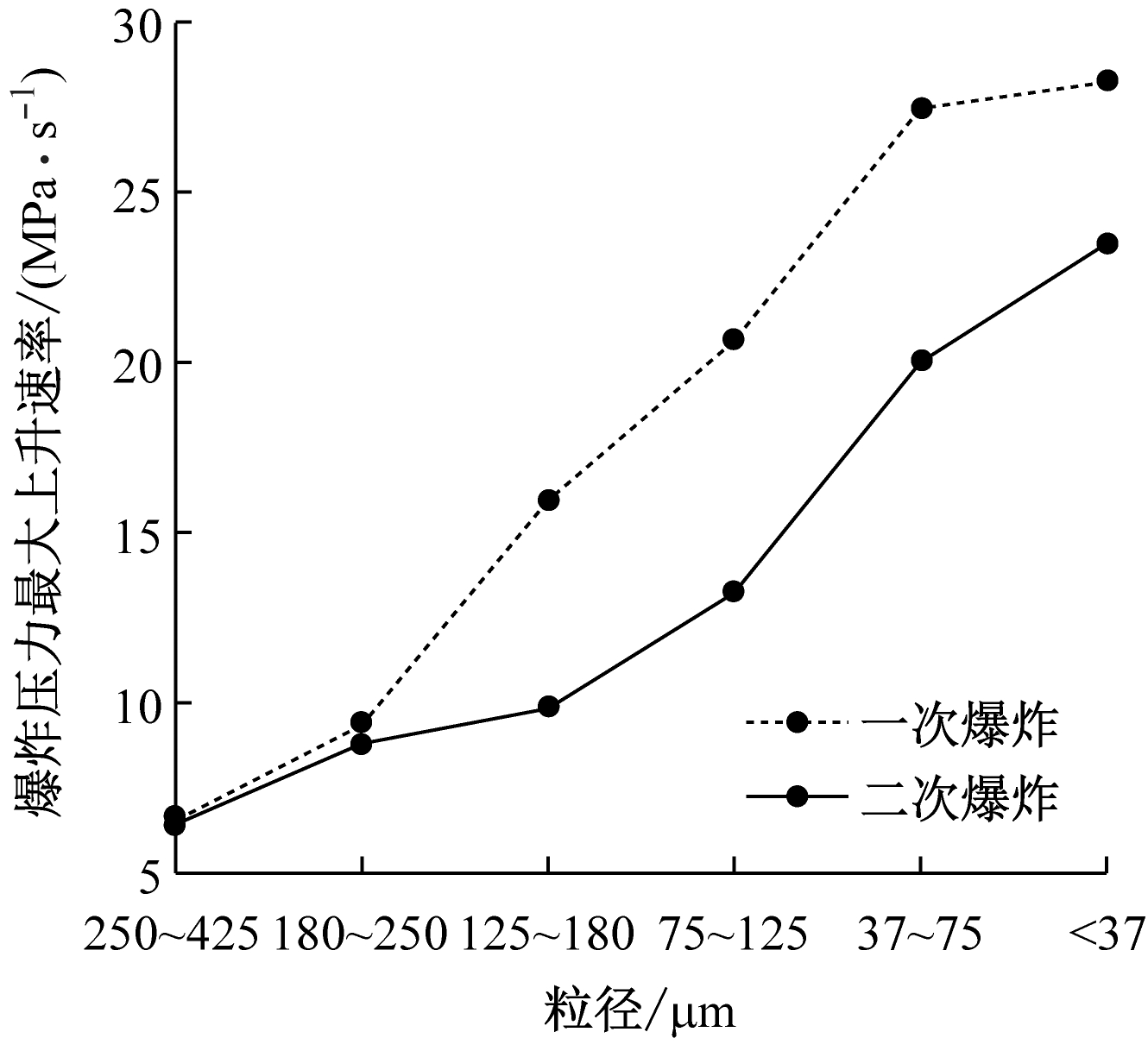 随着煤尘粒径的减小,煤尘二次爆炸压力最大上升速率的变化趋势与一次爆炸时相同,均为逐渐增大;爆炸压力最大上升速率差则呈先增大后减小的变化趋势。这是由于煤尘粒径越小,比表面积越大,氧气向颗粒表面扩散的时间缩短,反应加快,爆炸压力增大,一次爆炸和二次爆炸的压力最大上升速率不断增大;参与二次爆炸的固态产物与原煤尘相比,煤尘吸附性降低,可燃成分和挥发分含量减小,燃烧热的释放和传递越来越缓慢,二次爆炸与一次爆炸的压力最大上升速率差逐渐增大,在煤尘粒径为37~75 μm时达到最大,而后减小。