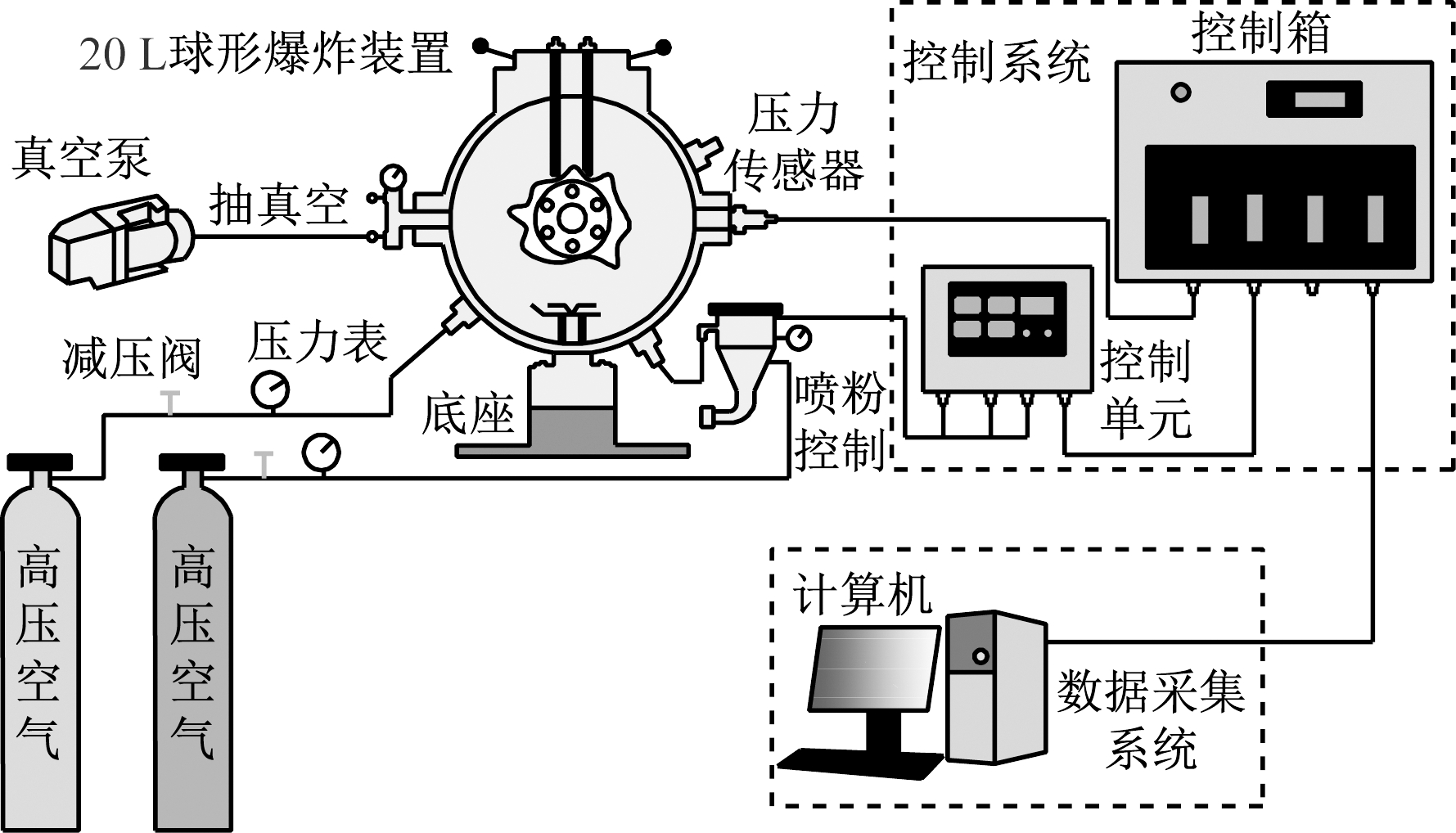 实验系统由20 L球形爆炸装置、控制系统和数据采集系统组成,如图1所示。该系统可用于测试煤尘的爆炸最大压力、爆炸压力最大上升速率和最佳爆炸浓度。