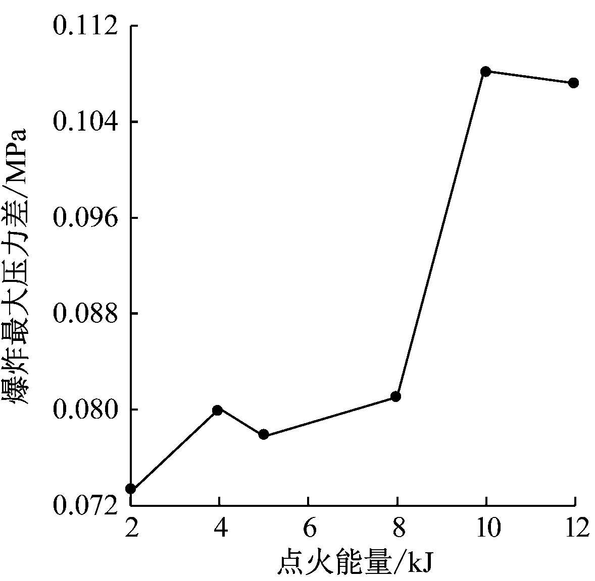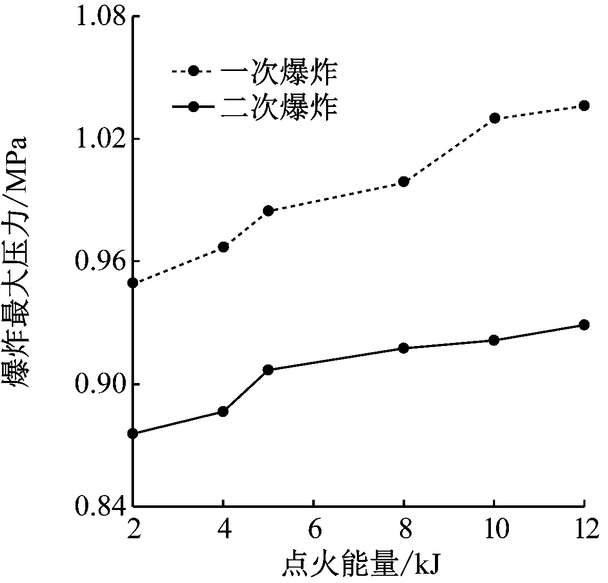(3) 随着点火能量的增加,煤尘二次爆炸最大压力和爆炸压力最大上升速率,以及爆炸最大压力差和爆炸压力最大上升速率差均呈增大的变化趋势。二次爆炸最大压力在点火能量高于5 kJ后缓慢上升,爆炸压力最大上升速率在点火能量高于8 kJ后基本保持不变,爆炸最大压力差在点火能量为10 kJ时取得最大值。