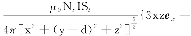 通过分析图2可知,在收发线圈所在平面垂直距离增大过程中,发射线圈磁感应强度模的最大值位置有2种情况:① 2个发射线圈圆心的正上方,即(0,-2,z),(0,2,z)处;②z轴上,即(0,0,z)处。这表明磁场传输方向在磁信号传输距离增大过程中发生了变化。