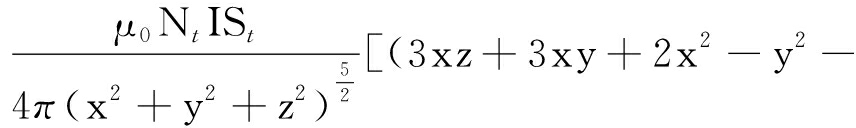 为单位向量,则A=cosα,B=cosβ,C=cosγ,α,β,γ分别为接收线圈与x,y,z轴的夹角,因此式(4)—式(11)可以用α,β,γ表示。需要注意的是,常系数C≠0,即接收线圈平面不能垂直于xoy平面。