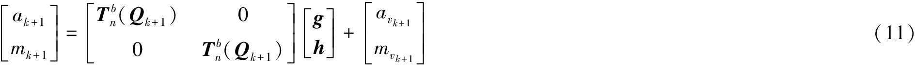 式中:ak+1,mk+1分别为加速度计、磁力计的测量数据;Tbn(Qk+1)为四元数旋转矩阵;g和h分别为归一化重力向量和磁场强度向量;avk+1和mvk+1分别为加速度计和磁力计的数据测量噪声,它们是均值为零且不相关的白噪声。