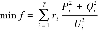 式中:f为配电网的网络损耗;ri为支路i(i=1,2,…,T)的电阻,T为配电网支路总数;Pi,Qi分别为支路i末端有功功率和无功功率;Ui为支路i末端节点电压。