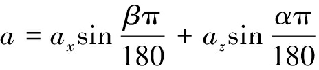 在实际运动过程中,用惯性导航模块测量加速度时受到重力加速度的影响,本文采用z轴加速度补偿的方法来消除重力加速度引入的误差。惯性导航模块加速度分布如图4所示。目标载体在初始原点S0,ax为沿x轴加速度,az为沿z轴加速度,ag为重力加速度,a为沿目标前进方向的实际运动加速度,α、β分别为z轴、x轴与重力加速度方向的夹角。目标载体的实际运动加速度计算公式为