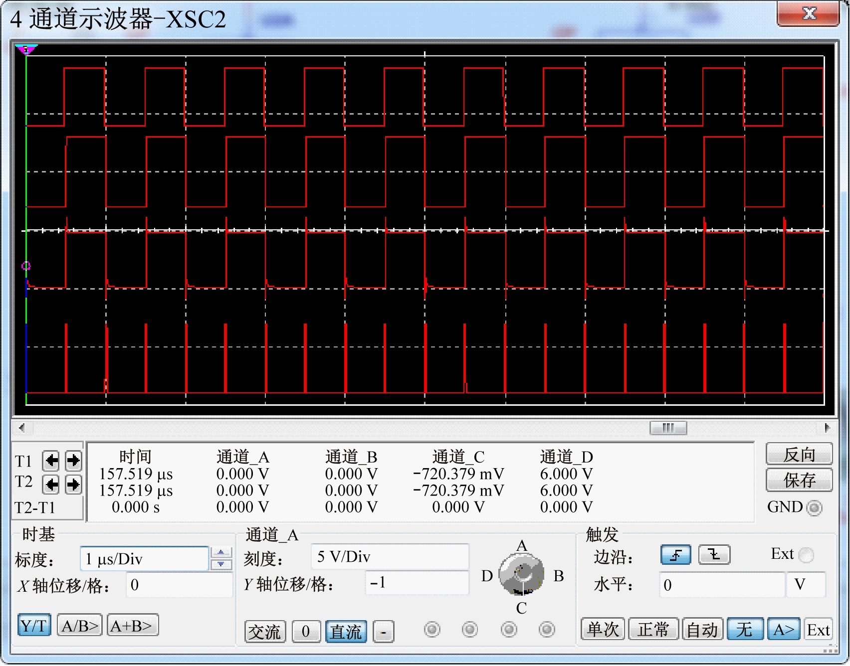 采用Multisim软件对设计的矿用硬件CAN总线中继器逻辑控制电路进行仿真。单端发送时,采用在Rx2端附加1个1 MHz方波信号的方式模拟CAN2总线上电平变化。仿真结果如图8所示,从上到下依次为Rx2,Tx1,Rx1,CP信号波形。