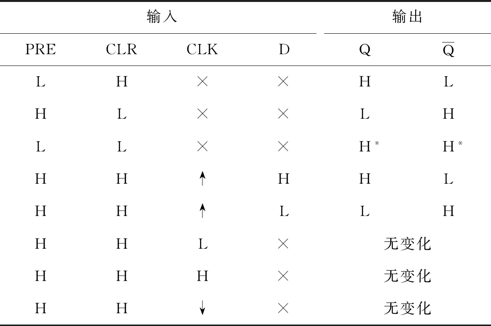 D触发器真值表见表1[14],其中H代表高电平,L代表低电平,H*代表无法确定,↑代表上升沿,↓代表下降沿。