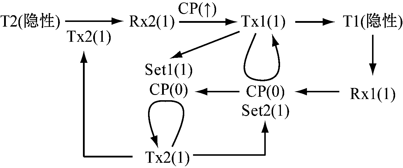 当T2端信号从显性跳变成隐性时,Tx2仍处于高电平。总线CAN2的仲裁结果为隐性。Rx2端接收到高电平,CP端产生上升沿,Rx2端高电平信号传递到Tx1端,总线CAN1的仲裁结果为隐性,这样T2端隐性电平传递到T1端。当达到高电平时,Tx1和Tx2通过反馈路径完成自锁,最终Tx1,Tx2在高电平达到稳态,T2端隐性电平可以持续传递到T1端。此时各信号转换如图6所示。