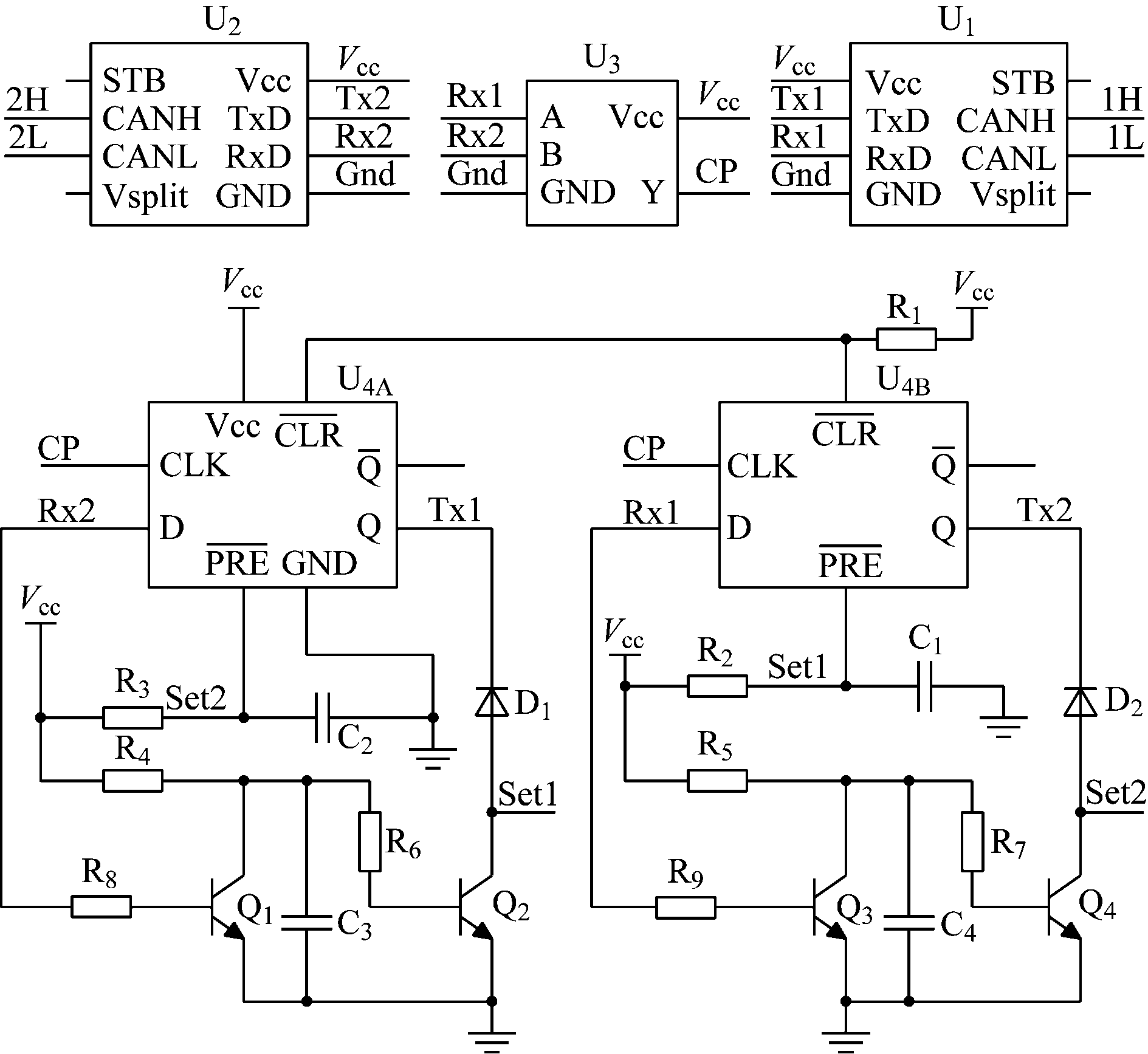 矿用硬件CAN总线中继器原理如图1所示,电路如图2所示。中继器核心是处于2个CAN收发器之间的逻辑控制电路,其主要由D触发器U4、异或门U3组成。D触发器主要用于控制TTL端电平信号传递,异或门用于产生D触发器翻转所需的脉冲信号。