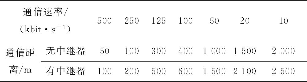 布置1个含有8个节点的CAN总线网络,MYHV电缆线径为1 mm2,矿用硬件CAN总线中继器在网络中间。统计在不同速率下有无中继器时CAN总线网络最大通信距离,结果见表2。可看出采用矿用硬件CAN总线中继器后,CAN总线网络的通信距离得到显著提高。