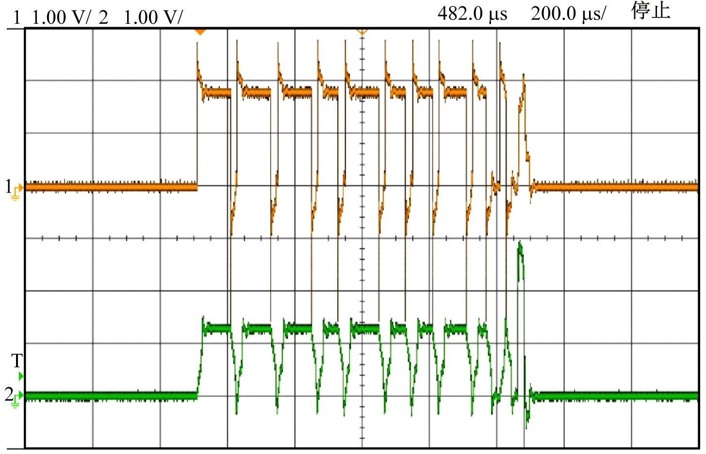两端同时发送时,采用在Rx2,Rx1端同时附加1个1 MHz方波信号的方式模拟两侧总线上的电平变化。仿真结果如图9所示,从上到下依次为Rx2,Tx1,Rx1,CP信号波形。
