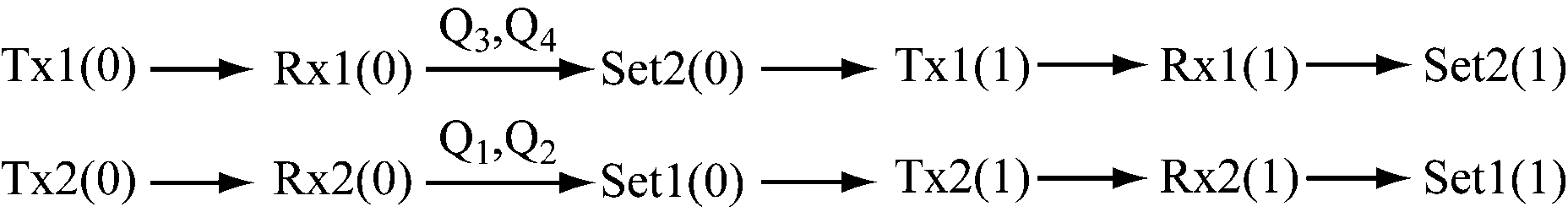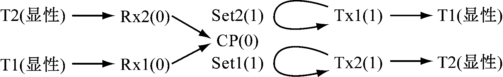 当CAN总线空闲时,反馈路径如图4所示(括号内为实时电平,0代表低电平,1代表高电平,下同),中继器R中的信号Tx1,Tx2,Rx1,Rx2,Set1,Set2均会在高电平时达到稳态。