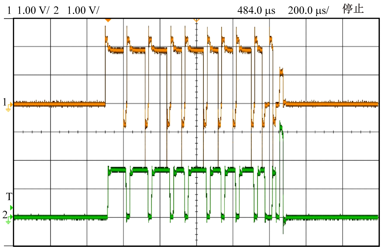 从图8可看出,单端发送时,Tx1,Rx1跟随Rx2波形变化,Rx1与Rx2之间存在约17 ns的延时,与仿真中选用的D触发器固有延时吻合。从图9可看出,两端同时发送时,Rx1,Rx2波形完全一致,没有延时。