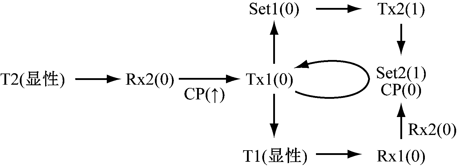 当T1,T2端信号同时从隐性跳变成显性时,Tx1,Tx2仍处于高电平,Tx1,Tx2通过反馈路径完成自锁,因此CAN1,CAN2仍呈显性电平,T1,T2端信号传输完成。此时各信号转换如图7所示。