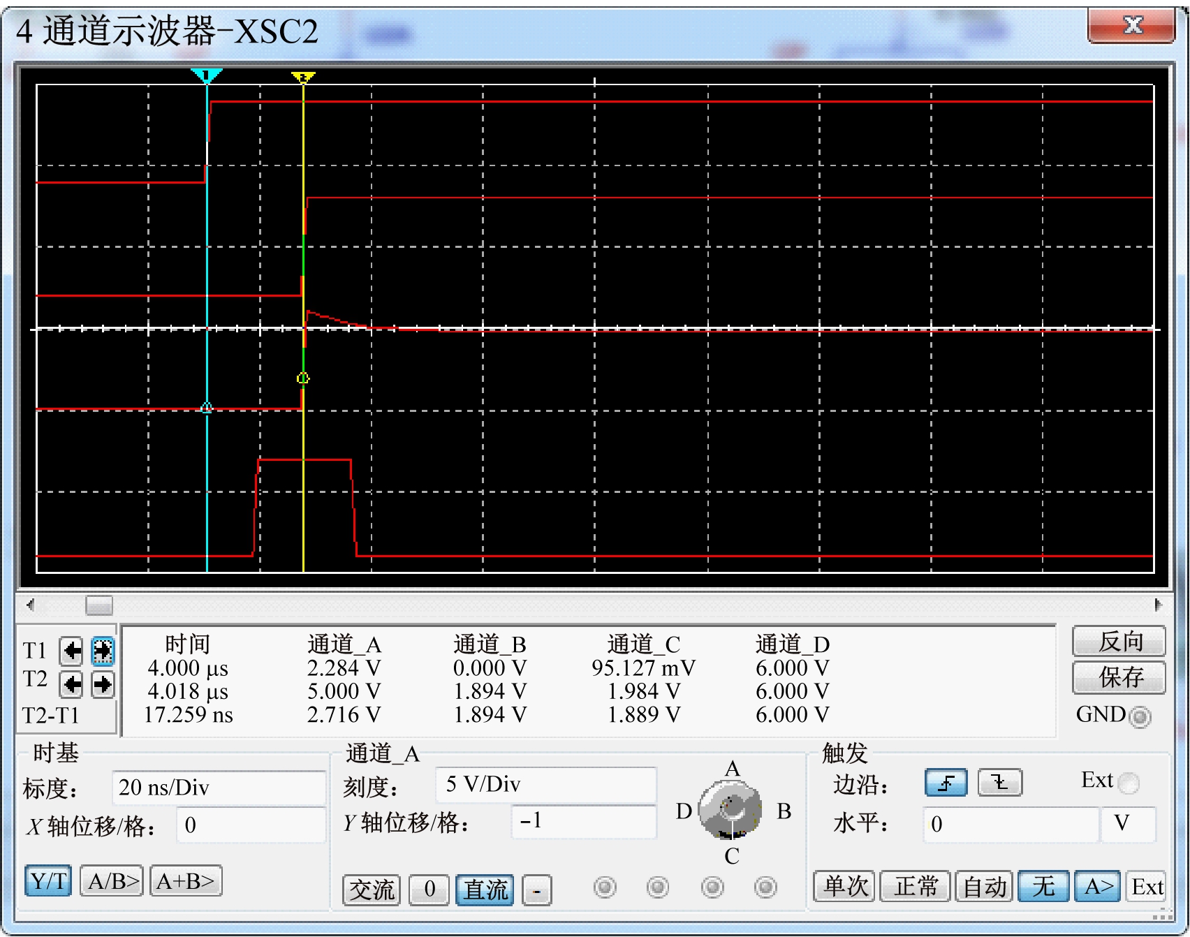 当T2端信号从隐性跳变成显性时,总线CAN2呈显性电平。Rx2端接收到低电平,CP端产生上升沿,Rx2端低电平信号传递到Tx1端,这样T2端显性电平传递到T1端。当低电平传递到Tx1端时,Tx1通过反馈路径完成自锁,最终Tx1在低电平时达到稳态,T2端显性电平可以持续传递到T1端。此时各信号转换如图5所示。