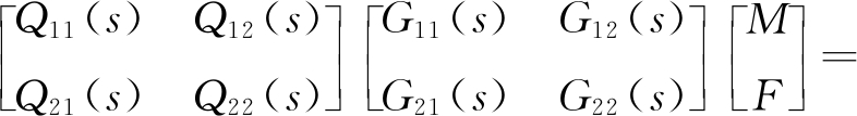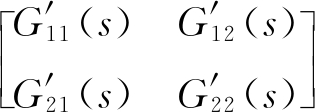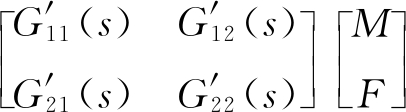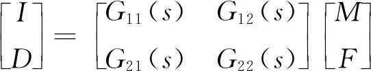 式中:I为主电动机工作电流;D为合格矿料产率;M为给料量;F为振动电动机频率;G11(s)为M对I的传递函数;G12(s)为F对I的传递函数;G21(s)为M对D的传递函数;G22(s)为F对D的传递函数;s为拉普拉斯算子。