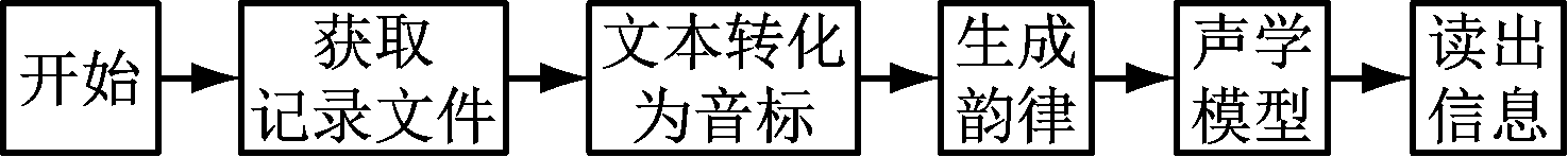语音合成技术将以其他方式存储的信息转换为语音[13],从听觉上实现人机交互。语音合成技术主要包括文本分析、韵律生成和声学模块。首先找到绑定的通知公告和待办提醒的文本,对要处理的文本进行分词、注音,输出音标序列。为了得到自然、可懂的语音输出,韵律生成模块需要对每个发音单元进行韵律调整,调整后的输出是包含韵律信息的音标序列。声学模块利用音标序列中的相应参数,选择合适的语音合成方法生成合成语音,读出文本信息。语音合成流程如图3所示。