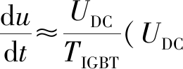 由图2可知,在IGBT开通瞬间,电流流入电容Cf,全部电压由电感Lf承受,Cf充电,其两端电压开始增大,此时负载(电动机)Lload承受的电压不只由IGBT决定,而是由Lf,Cf共同决定,此时